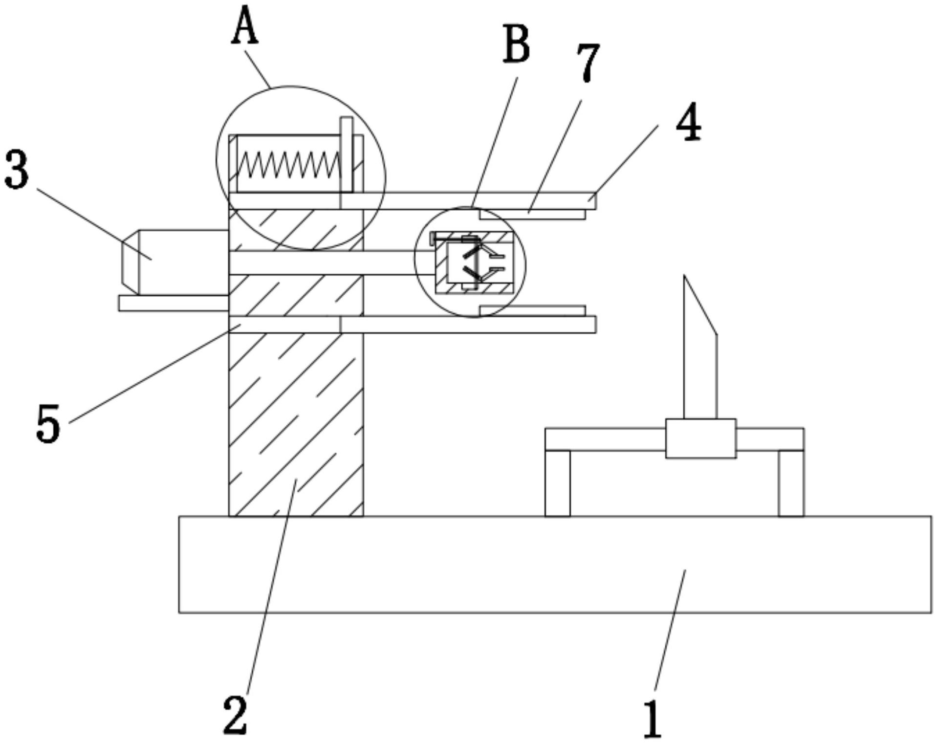 本实用新型属于加热设备领域,尤其是一种干壁钉加工用加热装置,包括底座,所述底座的顶部固定安装有连接座,连接座的一侧固定安装有电机,电机的输出轴贯穿连接座并固定安装有套筒,连接座的一侧开设有环形槽,环形槽内滑动安装有固定套,固定套的内壁上固定安装有加热器,环形槽的顶端内壁上开设有移动孔,固定套的顶端固定安装有推杆,推杆的一端固定安装有固定弹簧的一端,固定弹簧的另一端固定安装在移动孔的内壁上,固定套的两侧内壁上转动安装有两个对称设置的旋转杆,旋转杆固定套设在L形杆上。本实用新型设计合理,通过加热器能够对干壁钉进行加强,且便于对干壁钉进行夹持固定。