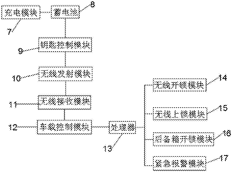 本实用新型公开了一种具有自动识别功能的便携式智能电动车钥匙,包括车钥匙本体、挂环、车门开锁键和车载控制模块,所述挂环设置在车钥匙本体的上端,所述车门开锁键设置在车钥匙本体上面,所述车门开锁键的下侧设置有后备箱开锁键,所述后备箱开锁键的下侧设置有车门上锁键。本电动车钥匙用于电动车的开关和启动,使用过程中,可以通过本钥匙对电动车进行近距离的遥控,通过钥匙上的无线发射模块和车内的无线接收模块实现遥控和自动识别,通过本钥匙可以实现对电动车的识别、对车门的开关锁和对后备箱的开锁,且本钥匙上设置有紧急报警键,可以通过车内的紧急报警模块使电动车发出报警声,起到紧急报警提醒的作用。