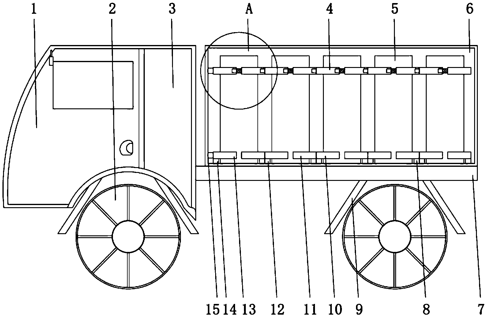 本实用新型公开了一种油漆桶运输装置,包括车头、第一上夹具、第一下夹具、第二下夹具和第三上夹具,所述车头一侧外端面焊接有底座,所述运输车本体焊接在底座的上表面,且运输车本体内部底端开设有滑道,所述运输车本体内壁上开设有滑道,且运输车本体内壁上滑动连接有第一连接杆,所述第一连接杆一侧外端面焊接有第三下夹具,且第三下夹具下表面焊接有第三滑杆,所述第三滑杆与运输车本体的内部底端滑动连接,所述第一下夹具下表面焊接有第二滑杆,所述第二下夹具下表面焊接有第一滑杆,所述第三上夹具一侧外端面插接有固定杆,所述第一上夹具的一侧外端面焊接有第二限位杆。本实用新型将运输车本体的空间充分利用且油漆桶放置更稳。