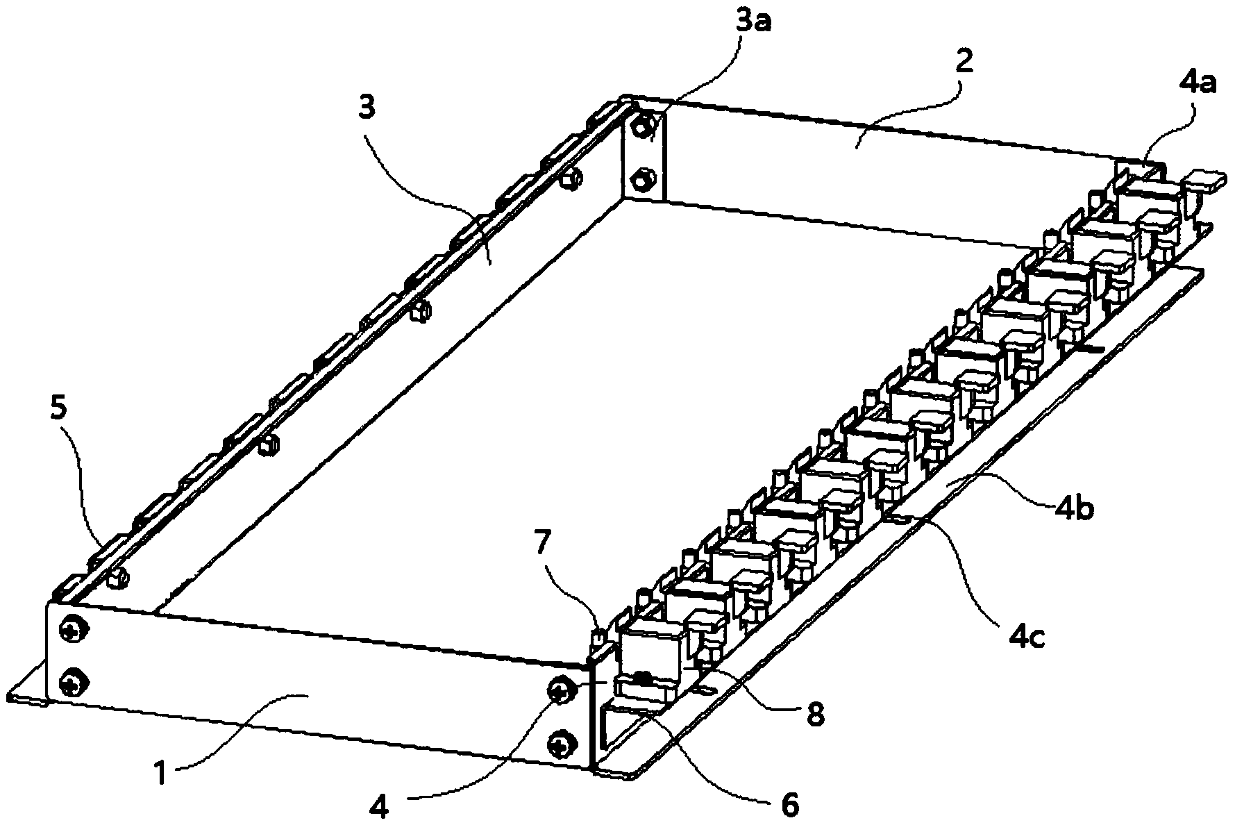 本实用新型公开了一种用于安检机探测板测试的快速拆装工装,包括:第一围板与第二围板,第一围板上设有用于压住探测板的压板,第二围板上设有用于卡住探测板的压扣;沿着第一围板的延伸方向,第一围板的两端分别设有朝向第二围板延伸的第一水平调节板,第一水平调节板上设有第一围板水平调节孔;沿着第二围板的延伸方向,第二围板的两端分别设有朝向第一围板延伸的第二水平调节板,第二水平调节板上设有第二围板水平调节孔;第一围板与第二围板通过水平调节组件连接。本结构用于作为支架用于安装探测板,简化探测板拆装过程,省去探测板拆装过程中拆装螺栓的步骤,降低探测板的测试工作量,节约操作人员大量的时间,提高探测板的测试效率。