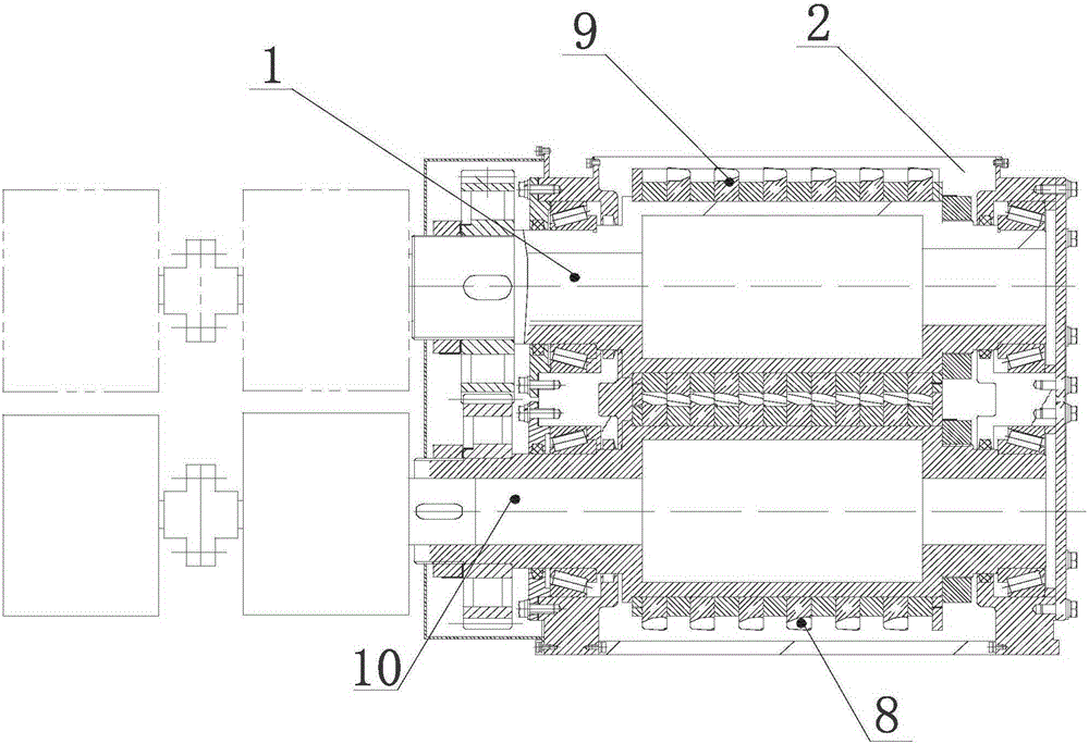 一种车载环保液压剪切粉碎机,由上箱体、下箱体、中间左箱体、中间右箱体、上刀轴、下刀轴组成;下箱体安装在车架之上,下刀轴上有刀盘、滚动轴承,整体安装到下箱体的轴承孔位置处;中间左箱体和中间右箱体通过定位销安装到下箱体之上;上刀轴上同样有刀盘、轴承,整体安装到中间左、右箱体的轴承孔位置处;上箱体通过定位销安装到中间左、右箱体之上。剪切粉碎机碎机的出口高于料仓滚筒底部,树枝粉碎后,碎屑落到粉碎机出口处有坡度的进料斗上,随之沿着斜面滑落至料仓底部,料仓正转进料,把树枝碎屑运送至料仓底部。本实用新型是树枝粉碎处理车的专用设备,处理后树枝体积是未经修剪后的1/6,无需再用运输卡车装载树枝,大幅减少运输车辆的费用。