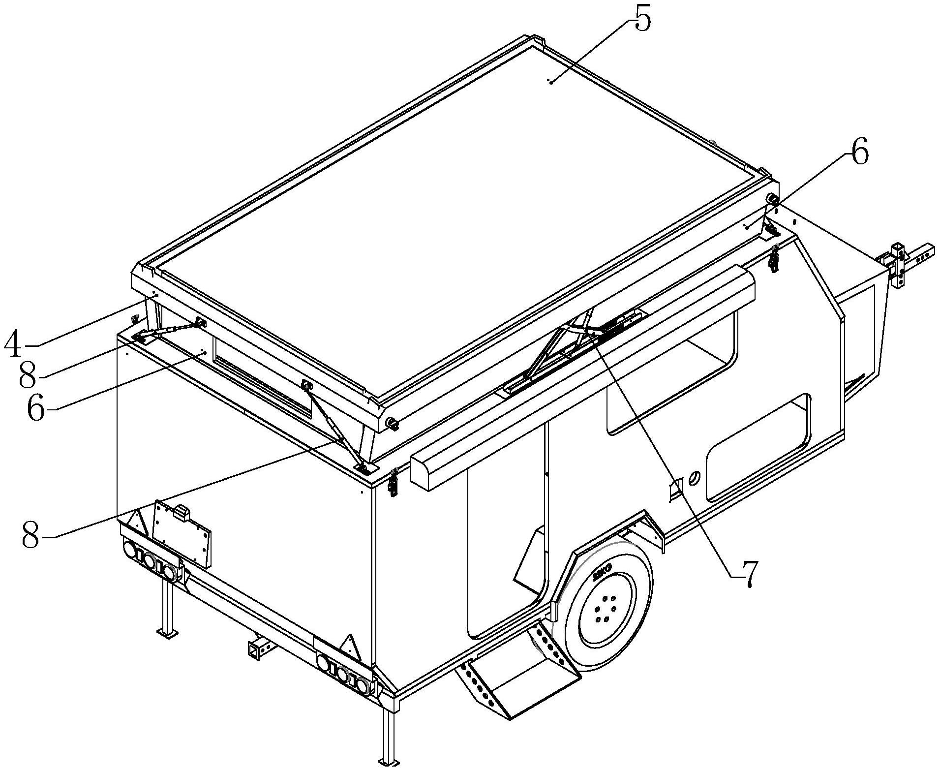 本实用新型涉及一种拖挂式房车的车体,包括底盘及车厢,其特征在于:车厢的顶部设有升降顶组件,升降顶组件包括升降框、驱动升降框升降的升降驱动装置、与升降框连接的顶板、位于升降框内侧的多个围板,升降驱动装置安装于车厢上,升降驱动装置的输出端与升降框连接,围板的一侧铰接于车厢上,另一侧与升降框可拆卸地连接。本实用新型的拖挂式房车的车体,密封及安全性能高、保温及减震效果好且抗冲击性好。