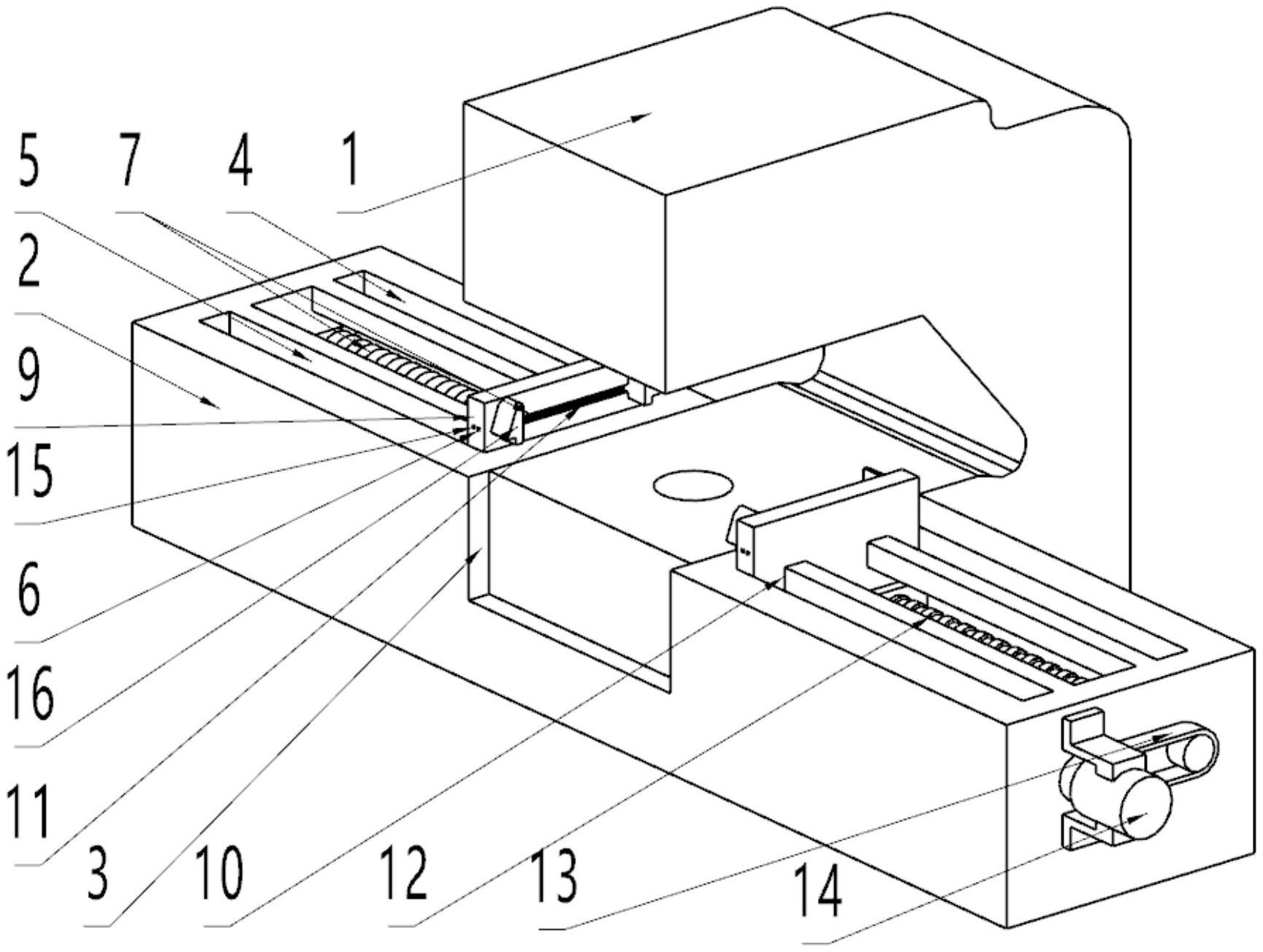 本实用新型公开了一种可调节长度的防火门扇堵头冲孔机用限位装置,包括本机主体、限位体、卡槽、内置槽、双向丝杠和装夹块,所述本机主体的外表面中端卡合连接有限位体,且限位体的上表面开设有卡槽,并且卡槽的上表面固定连接有本机主体,所述限位体的内表面开设有内置槽,且内置槽的内表面上端固定安装有滑道,并且内置槽的内表面固定安装有导柱。该可调节长度的防火门扇堵头冲孔机用限位装置,设置可进行移动的滑块,在使用时通过滑块在不同位置的使用,带动防火门需要的打孔的部件往一端进行移动,且在使用时一端通过复位弹簧的弹性进行移动,一端使用丝杠带动夹板进行移动,可防止在打孔过程中部件移动的位置过多,导致制作效率的下降。
