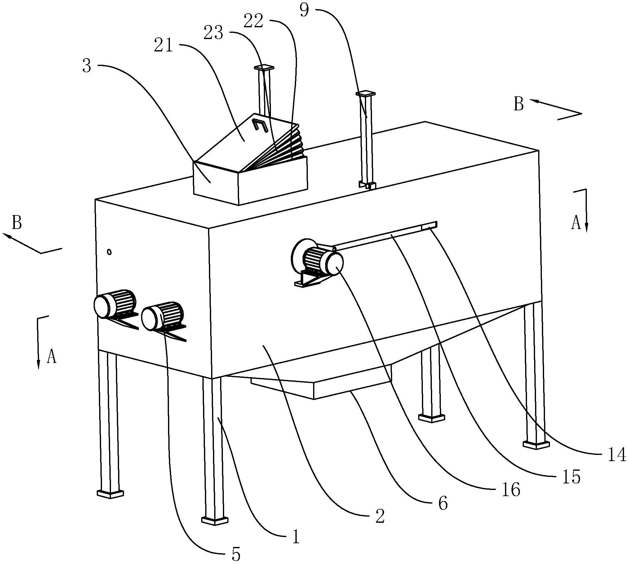 本实用新型公开了一种双轴搅拌机,涉及食品加工设备技术领域。其技术要点是:包括机架,所述机架上设置有搅拌箱体,所述搅拌箱体的顶面设置有进料口,所述搅拌箱体内沿水平方向设置有两根搅拌轴,所述搅拌箱体的侧壁设置有两个第一电机,两个所述第一电机的壳体与搅拌箱体侧壁固定连接,所述搅拌箱体的下端设置有出料口,所述搅拌箱体内沿水平方向设置有推板,所述推板位于与搅拌轴平行的搅拌箱体的两侧面,所述推板与搅拌箱体内侧壁贴合,所述推板上沿竖直方向设置有推杆,所述搅拌箱体的顶壁设置有驱动推板升降的升降组件。本实用新型具有出产率高的优点。