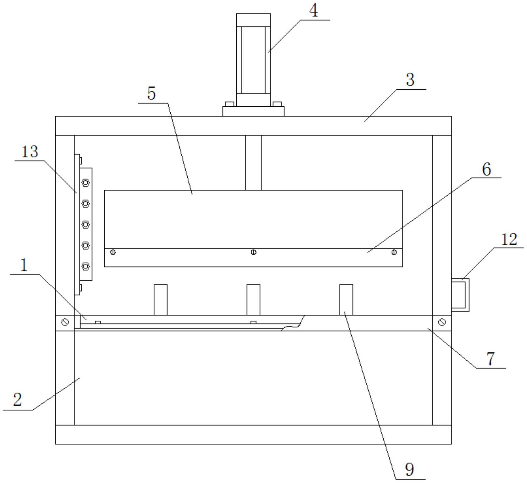 本实用新型公开设有折弯保护装置的数控折弯设备,承压模具的前后侧为安装条,承压模具通过螺钉a固定在支撑台的上方,支撑台的外侧焊接有外罩,外罩包括左侧板、右侧板、底板、后侧板和顶板,顶板的上方前侧通过螺钉b安装有第一液压缸,第一液压缸的下方为升降轴,升降轴的下方螺接有下压板,下压板的后上方焊接有螺接套a,下压板的下方通过沉头螺丝安装有可拆卸压头,可拆卸压头的上方内侧设有与下压板相匹配的卡槽,外罩的前侧通过螺钉c安装有安全限位板。通过安全限位板和防潮件的设置,可以拉远工人与折弯设备的距离,在保护工人的同时,防潮件还能对金属材质的折弯设备组件起防潮防护作用,并且通过可拆卸压头的设置,可以减少更换成本。