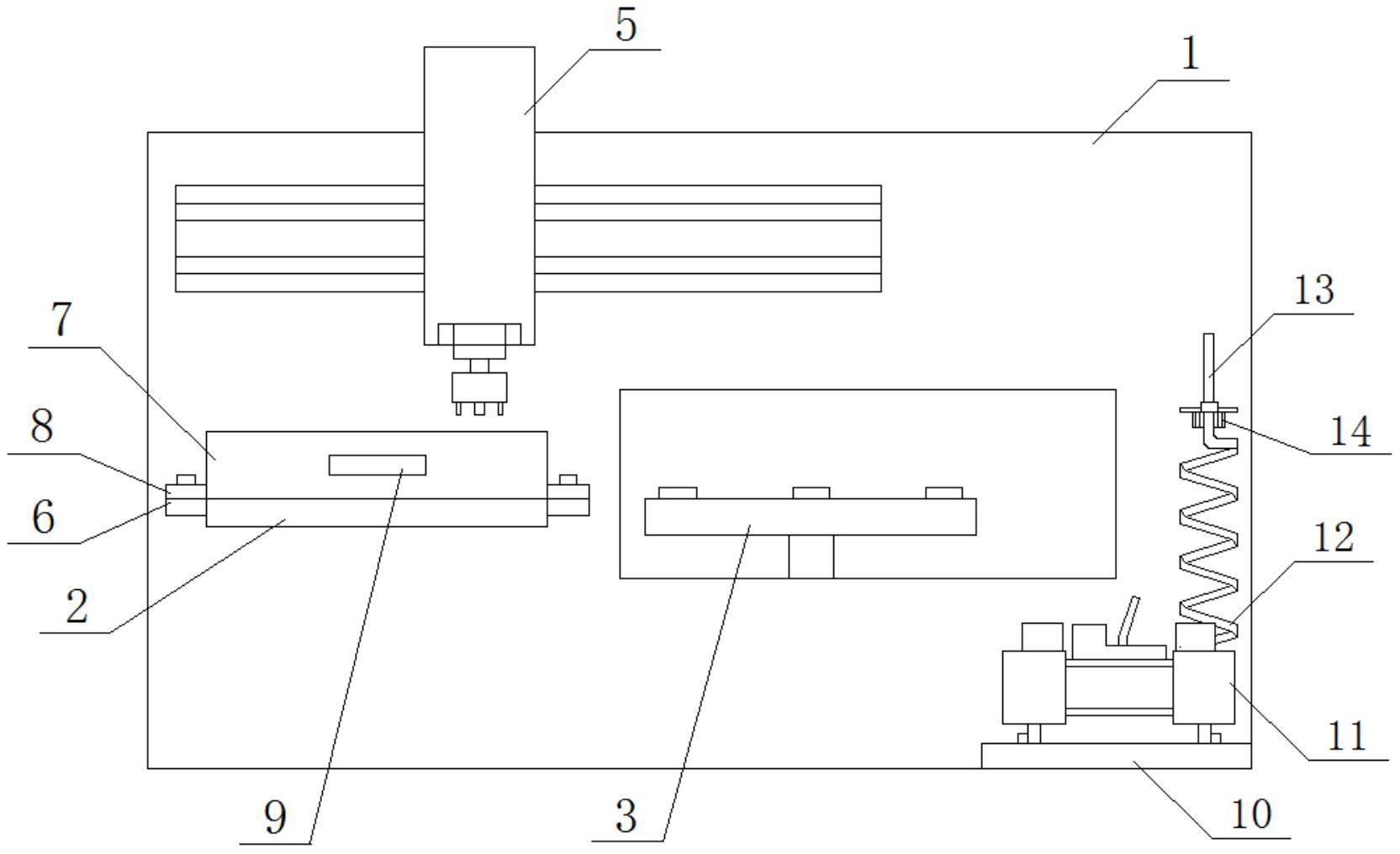 本实用新型公开了设有换模装置机构的数控转塔冲床,模具库的左右两侧均焊接有固定块,固定块的上表面设有螺纹槽a,固定块的上方通过锁紧旋钮固定有防尘罩,防尘罩的后侧为敞开式结构,防尘罩的左右两侧下方均焊接有安装块,防尘罩的前侧通过螺丝a安装有拉手,冲床机架的右下方前侧焊接有底座,底座的上方焊接有限位条,左右两侧限位条之间卡装有碎屑清理气泵,碎屑清理气泵的出气嘴通过接头连接有延长气管,延长气管的另一端通过固定头螺接有喷气头,喷气头位于转盘的右侧。通过防尘罩的设置,可以在数控转塔冲床未工作时,对模具库起防尘作用,并且通过碎屑清理气泵和喷气头的设置,方便了对转盘上的碎屑及时清理。