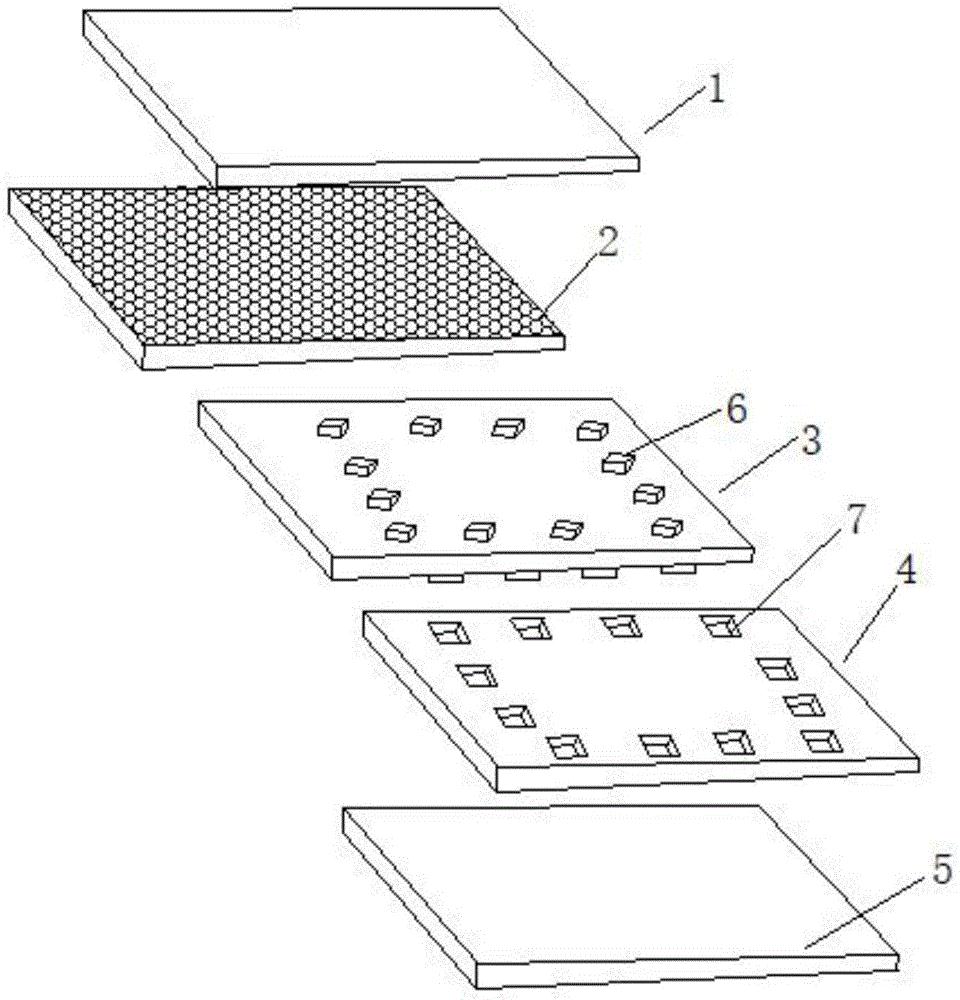本实用新型公开了一种OSB防虫板材,包括面板层、一级防虫板、保温层、二级防虫板和底板层,保温层向上依次是一级防虫板和面板层,该保温层向下依次是二级防虫板和底板层,所述面板层和一级防虫板之间通过胶黏剂粘结,所述保温层的上下两面分别设有若干个凸台,所述一级防虫板和二级防虫板分别设有与所述凸台位置相对且数量一致的凹坑,所述底板层和保温层通过胶黏剂粘结,所述面板层、保温层、底板层的位置上下对齐并与一级防虫板和二级防虫板相错,所述一级防虫板向一侧凸出错开,而二级防虫板向相反方向凸出错开。本实用新型的板材防虫效果好,结构简单,连接稳固易实现。