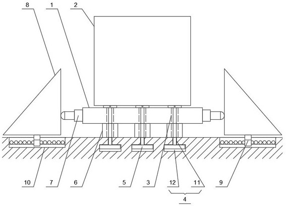 本实用新型提供一种电瓶车充电桩固定架,属于充电桩技术领域,包括底板,所述底板上设置充电桩,所述底板上开设多个穿孔,所述穿孔下方的地面上开设多组固定孔座,所述穿孔与所述固定孔座一一对应,所述穿孔与其一一对应的固定孔座内穿设固定铆钉,所述底板与地面之间的固定铆钉上套设支撑环,所述底板两侧设置液压缓冲机构,所述液压缓冲机构端部设置缓冲座,所述缓冲座下设置燕尾榫头,所述燕尾榫下方的地面设置燕尾榫槽,所述燕尾榫头卡设在所述燕尾榫槽内;本实用新型可以快速安装拆卸,而且还能对碰撞进行缓冲。