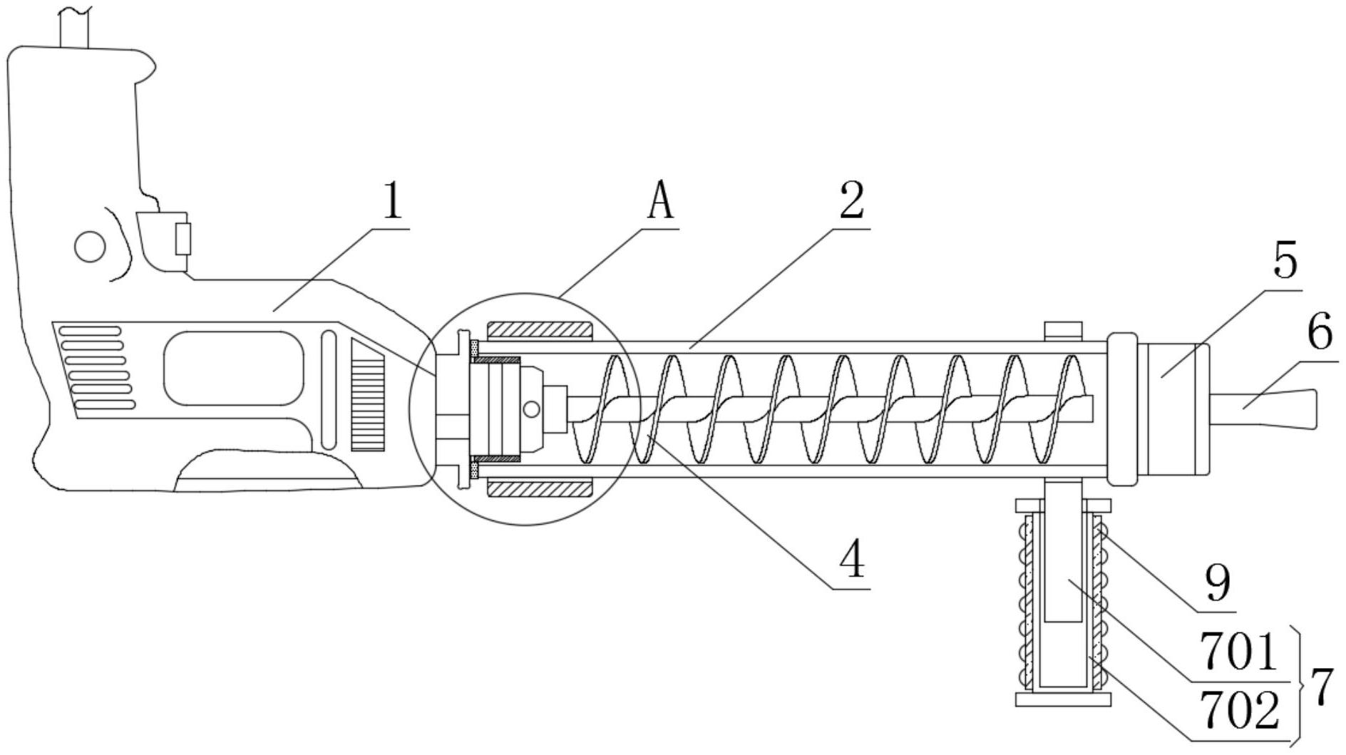 本实用新型提出了一种输送带修补用冷补胶枪,包括单倒手持式电钻,所述单倒手持式电钻的右侧螺纹连接有螺旋挤出轴管,所述螺旋挤出轴管的正面开设有冷胶入料口,所述单倒手持式电钻的右端固定安装有莫氏锥柄,所述莫氏锥柄位于螺旋挤出轴管的内侧,所述螺旋挤出轴管的右端固定连接有出料枪头。该实用新型,通过单倒手持式电钻作为动力,通过装在螺旋挤出轴管内的莫氏锥柄,莫氏锥柄呈螺旋状,由冷胶入料口进入的冷补胶条挤压到出料枪头处,由出料口排出,从而可电动的把冷补胶料推送至损伤部位,使冷补胶料深入到更微小的缝隙,对受伤部位的粘贴施加较大的压力,粘接更牢固,强度更大。