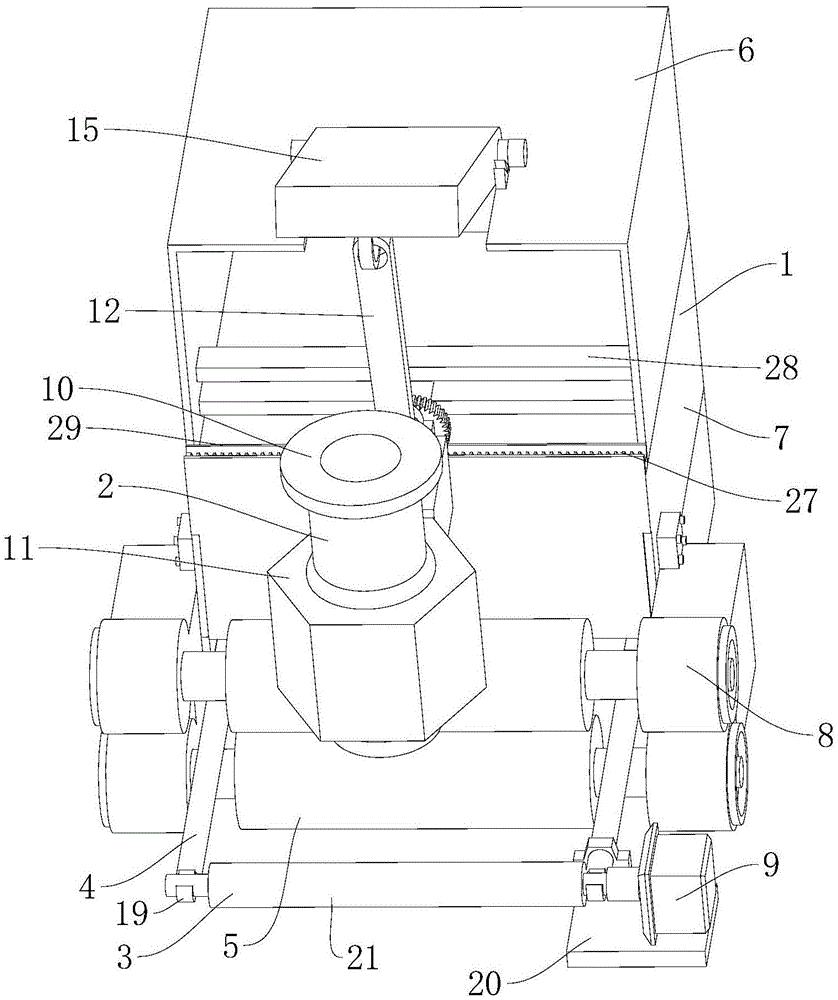 本实用新型本实用新型涉及纱线技术领域,具体涉及前纱线收卷机构,包括有机架、入料机构、收卷筒、两个收缩杆和两个滚筒,机架还包括有均呈水平设置的上机座和下机座,下机架的左右两侧分别安装有用于固定两个滚筒的轴座,两个滚筒的端部之间设有供收缩杆穿过的间隙,收卷筒还包括有旋转电机,电机的输出轴与收卷筒传动连接,入料机构还包括有圆柱形入料通道、入料外壳、连接杆、旋转机构和横向位移机构,上机座顶部靠近开口一侧设置有与上机座铰接的活动板,通过旋转电机直接与收卷筒传动连接,从而更加高效的实现收卷纱线,通过入料机构的旋转机构实现了纱线先旋转后收卷,收缩杆实现了收卷筒和滚筒在运行时时刻抵触,使得纱线收卷更加精准。