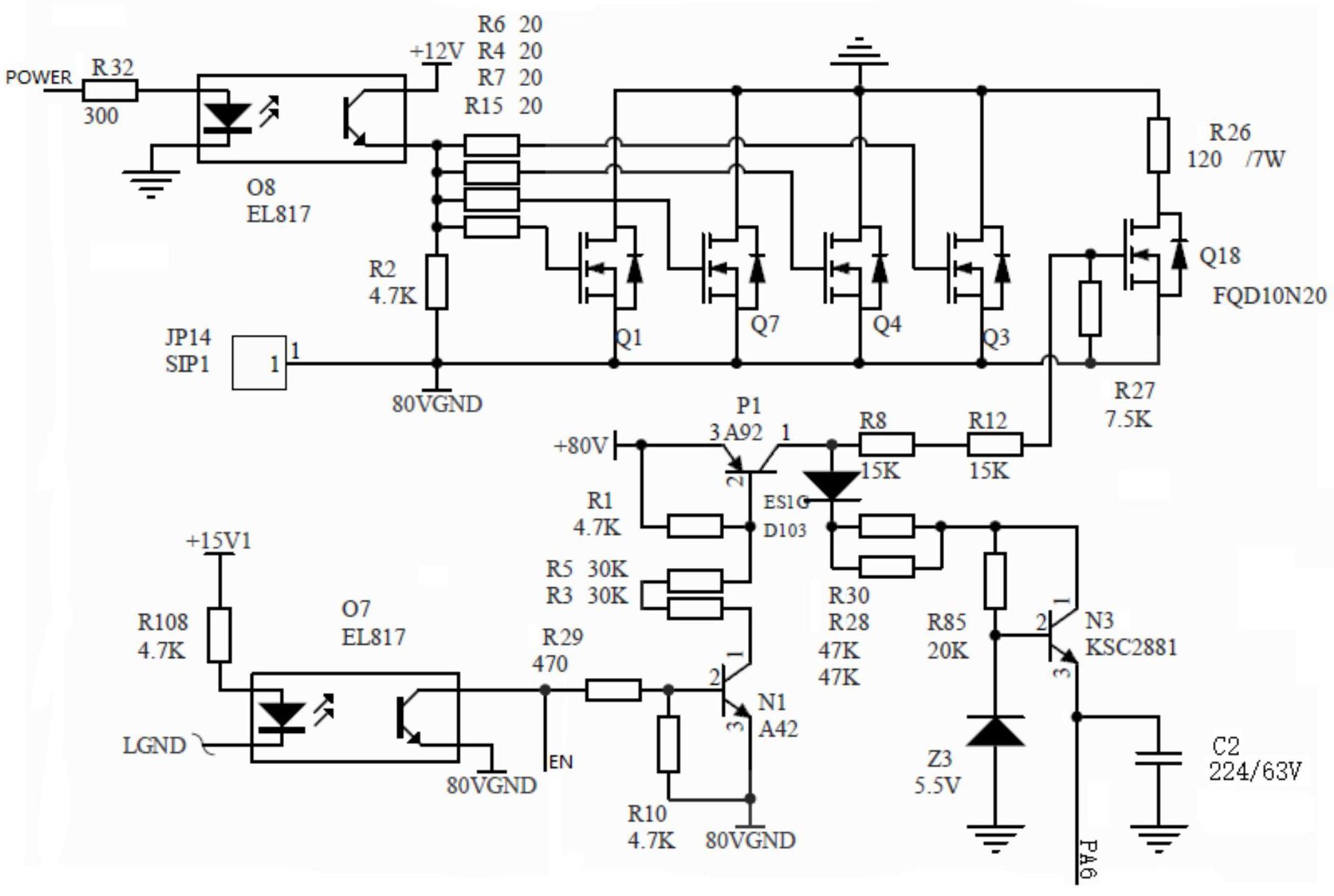 本实用新型涉及逆变器技术领域,具体地说是一种减小浪涌冲击的预充电电路。一种减小浪涌冲击的预充电电路,包括电源,其特征在于:所述的电源正极分别连接电阻一一端、三极管一发射极,电阻一另一端分别连接三极管一基极、电阻五一端,三极管一集电极分别连接二极管一百零三阳极、电阻八一端,二极管一百零三阴极分别连接电阻三十、电阻二十八一端,电阻三十、电阻二十八另一端合并后分别连接电阻八十五一端、三极管三集电极。同现有技术相比,解决了大功率逆变器输入端电流浪涌大的问题,减小了电池端受到的冲击与损耗,提高了充电稳定性,延长了电池寿命,避免触发锂电池保护板的过流保护。