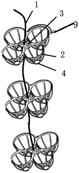 本实用新型涉及柿子加工领域,尤其涉及新型柿子挂架。新型柿子挂架包含一组以上的网兜,一组以上的网兜固定在十字架(3)上,十字架(3)中部包含穿过孔,四个网兜中间由十字架连接,十字架为塑料杆,中间凸起的圆孔为穿绳孔,绳子上串有多个网兜,每个网兜均为单元,单元为塑料,单元包含单元上口(2)和单元下口(4),单元上口(2)和单元下口(4)之间通过多个连接塑料连接;一组以上的网兜被串在绳子上。有益效果:不需要传统的柿把夹住固定,大大提高了效率。使用该产品比传统的方法更便捷且更高效。