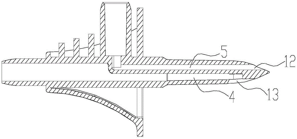 一种一次性使用无菌药液转移器进气式穿刺器,包括穿接管以及连通于穿接管后端的进液管,所述进液管的外围设有手持部;所述穿接管的前端向前延伸出一穿刺部;所述手持部上设有进气口;所述进液管后端设有出液口;所述穿接管内设有不相互连通的液体通道和气体通道,所述液体通道的横截面积为5.0±1.0mm<sup>2</sup>;所述气体通道一端延伸至进气口,另一端沿穿接管轴向延伸至穿刺部侧面形成出气口,气体通道的横截面积为1.1±0.5mm<sup>2</sup>;所述穿刺部的侧面设有和出气口沿轴线呈阵列分布的三个进液口。该一次性使用无菌药液转移器进气式穿刺器,液体通道与气体通道的具有较佳的内径比,进液口总面积较大,该一次性使用无菌药液转移器进气式穿刺器的气液压比佳,进液出气通畅,使用方便。