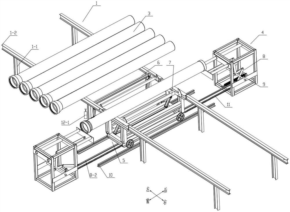 本实用新型涉及一种球墨铸铁管生产线对中装置,属于球墨铸铁管生产技术领域,解决了传统通过人工目测进行对中存在偏差、效率低等技术问题。解决方案为:一种球墨铸铁管生产线对中装置,包括两组推移装置、对中小车、第一翻转移动装置、第二翻转移动装置、推管装置、推管驱动装置、监控装置和控制系统,两组推移装置之间设置有前后方向的两条轨道,对中小车滑动设于轨道上,第一翻转移动装置将球墨铸铁管推入对中小车顶面,第二翻转移动装置进行球墨铸铁管的定位和输送,推管驱动装置驱动推管装置对设于对中小车上的球墨铸铁管两端进行推动对中。本实用新型实现了球墨铸铁管的精确对中,自动化程度高,节省人力,降低了成本,提高了效率。