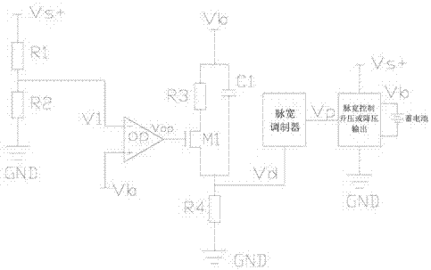 本实用新型公开一种光伏组件电压控制电路,包括控制电路、脉宽调制器、脉宽控制升压或降压输出电路,其特征在于:所述控制电路包括电阻R3和电阻R4,电阻R3与MOS开关管M1串联,串联之后与电容C1并联,电阻R4串联于此并联电路之下,电阻R3与基准电压源输出端相连,电阻R4接地,MOS管M1的栅极连接电压比较器OP的输出,电压比较器OP的其中一个电压输入端与基准电压源输出端相连,电压比较器的另一个电压输入端与分压电阻R1和分压电阻R2之间相连,分压电阻R1与光伏组件电压输出端相连,分压电阻R2接地。从而能将组件输出电压稳定在最大功率处,实现提高充电效率的效果。