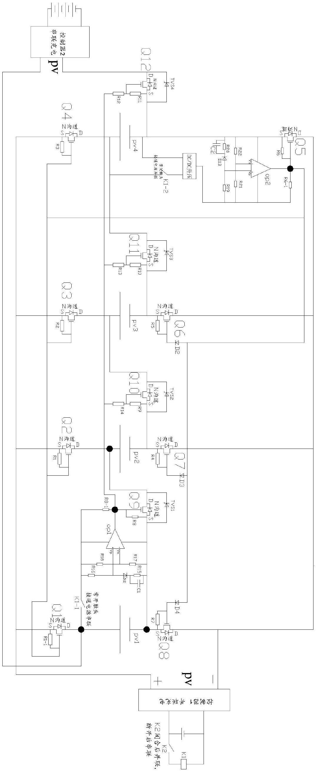 本实用新型公开了一种DC电源的串并联自动切换控制电路,包括在光伏组件上通过多个N沟道MOS管的相互连接,并采用继电器K1在串联和并联之间进行切换,实现对两侧进行不同电压的输出。本实用新型具有以下优点和效果:通过开关投切,简单实现DC电源串联并联的自动切换,方便了电源的组合使用。