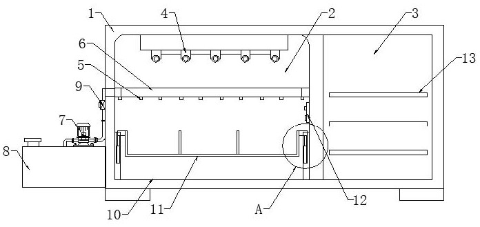 本实用新型公开了一种用于地坪漆研发的耐候性测试装置,包括耐候测试箱,耐候测试箱的内部开设有测试仓和对照仓,测试仓内壁的顶部固定安装有测试灯组,测试仓内壁的中部固定设置有喷淋环管,喷淋环管的底部固定安装有多个均匀分布的雾化喷头,测试仓内壁的底部固定设置有蓄流浸泡池,本实用新型一种用于地坪漆研发的耐候性测试装置,该测试装置设有测试仓和对照仓,能够在测试过程中将测试的产品与未测试的产品进行对比,便于测试人员得出相对准确的测试数据,能够模拟使用过程中地坪漆的耐高温、耐水和光照等各项性能,各项测试因素能够进行精准的调节,使得出了的测试结果更加科学准确,操作简单方便,稳定可靠。
