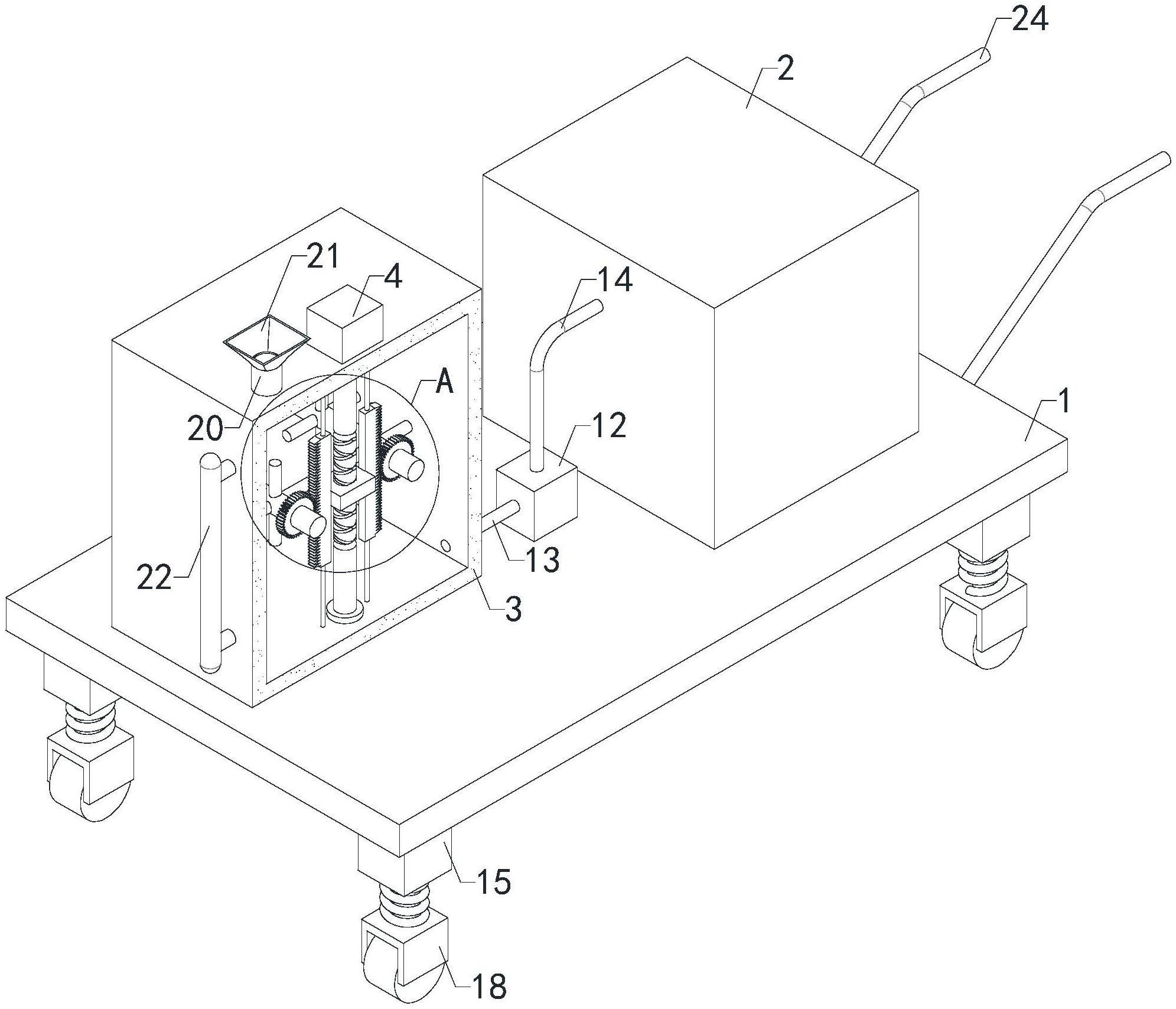 本实用新型涉及蒸汽发生器的技术领域,特别是涉及一种模块化便移式电加热蒸汽发生器,其提高便捷性;包括底板、移动机构、蒸汽发生器、箱体、电机、往复丝杠、移动块、齿条、光杠、转轴、搅拌杆、齿轮和输送机构,移动机构安装在底板底端,蒸汽发生器和箱体均安装在底板顶端,箱体内部有腔室,箱体顶端设置有进口,电机安装在箱体顶端,电机输出端设置有往复丝杠,往复丝杠底端延伸至腔室中并且与腔室底端转动连接,移动块与往复丝杠螺纹连接,移动块的左右两端分别设置有齿条,两组光杠顶端均连接腔室顶端,两组光杠底端均连接腔室底端,两组齿条分别与两组光杠滑动连接,两组转轴后端转动连接腔室后端。