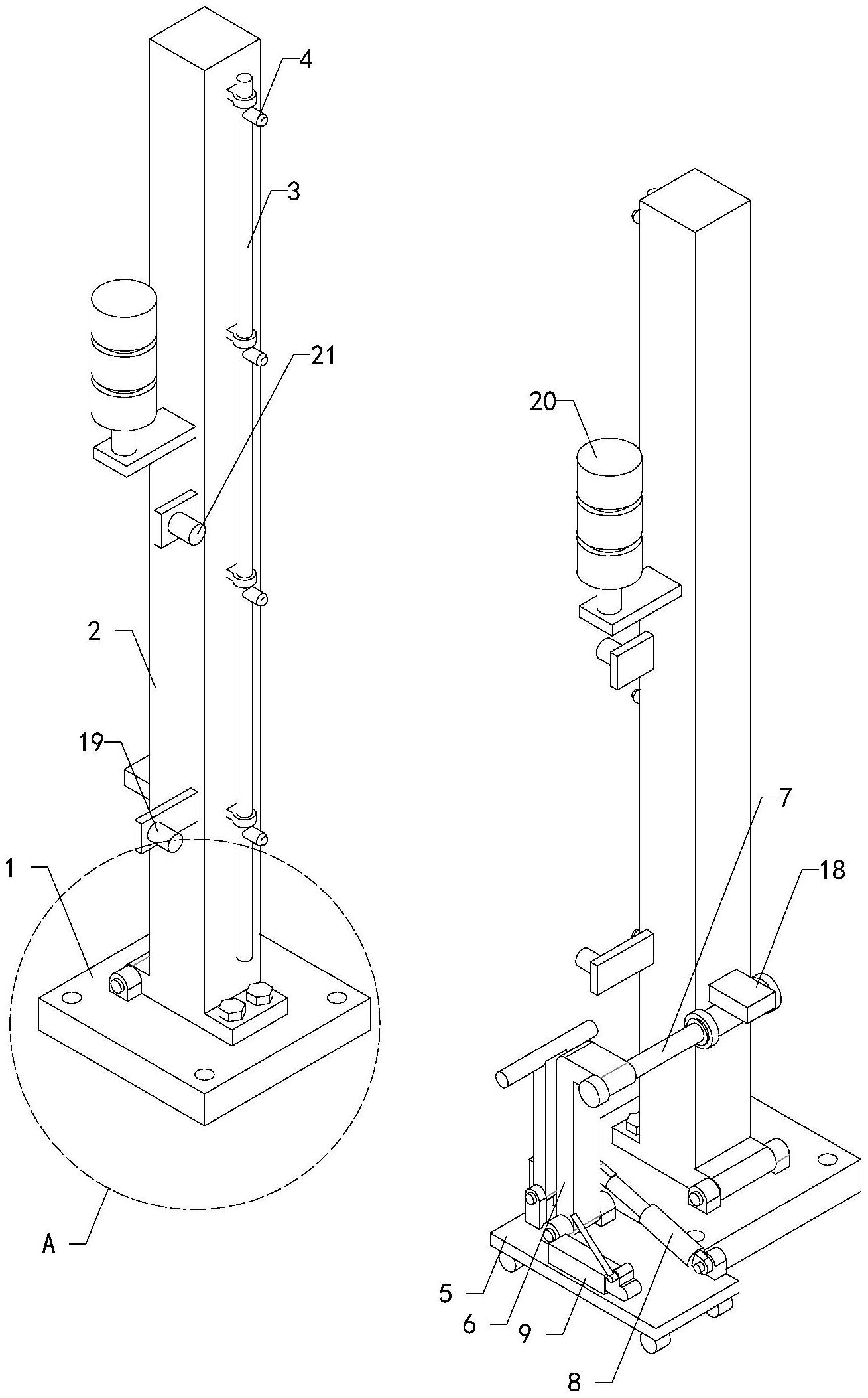 本实用新型涉及车辆消毒的技术领域,特别是涉及感应式车辆消毒通道,其无需吊车吊装,降低安装成本和时间,实用性高;包括多个立柱和立柱小车,多个立柱分两排对称布置构成消毒通道,立柱还包括底板、转动柱、高压水管和多个喷头,立柱小车还包括小车、摆臂、推杆、油缸和手压泵,转动柱的下端转动安装在底板上,高压水管安装在转动柱的内侧壁上,高压水管上安装有多个喷头,摆臂的下端转动安装在小车左部,摆臂的上端安装有推杆,推杆的后端伸出小车的外界,并且推杆的外端与转动柱的外侧壁接触,油缸的固定端转动安装在小车的上端面的右部,油缸的移动端与摆臂的中部转动连接,手压泵安装在小车的上端面上,手压泵与油缸通过高压油管连接。