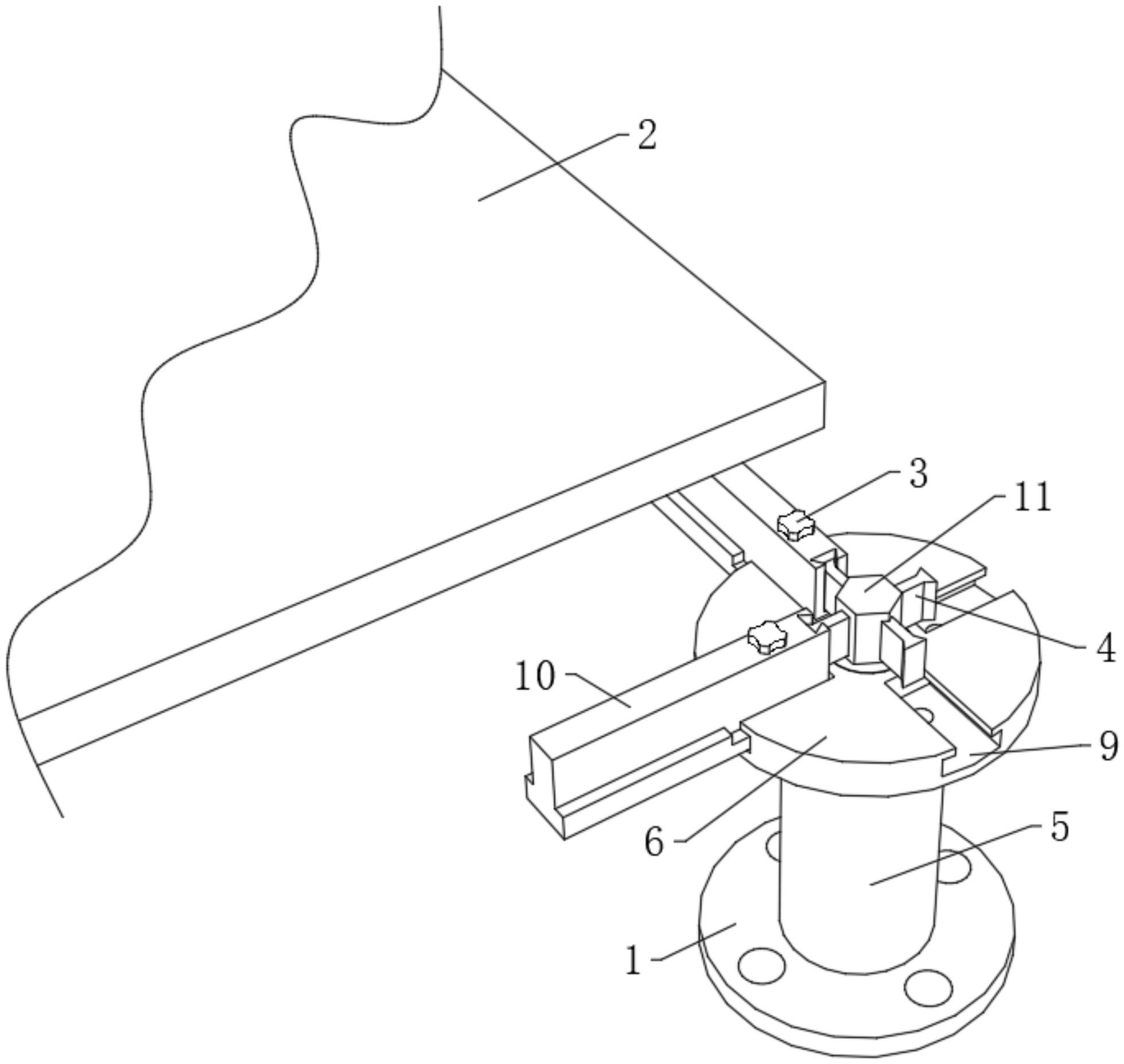 本实用新型公开了一种地板支撑架及架空地板,包括底座,所述底座的上表面中部固定连接有螺纹筒,所述螺纹筒的上方设有托盘,该托盘的中心转动连接有与螺纹筒螺纹连接的螺纹杆,该螺纹杆的上端与托盘的表面平齐并开设有内六角槽。通过将T形插条插入T形卡槽中,通过螺栓连接件对T形插条的位置进行固定,随后通过六角扳手插入内六角槽中转动螺纹杆,带动托盘进行高度调节,随后将地板的一角放置在托盘表面,完成安装,当需要调节某一点的高度时,将地板取下,转动螺纹杆即可,直至地板不再翘边,整个针对地板一角翘边的调节过程快捷方便,同时可在地板安装之后根据情况进行实时调节,避免了重复拆装,提高了实用性。