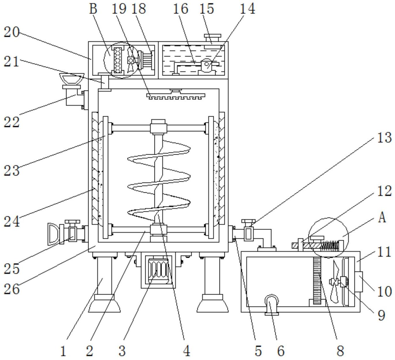 本实用新型公开了一种化工原料混合用的高效率混合机,包括第二电机、加热箱和箱体,所述箱体一侧的顶端安装有进料口,且进料口下方箱体的一侧安装有第二阀门,所述箱体顶端的一侧安装有加热箱,且加热箱内部的一侧安装有第二电机,所述箱体一侧底端安装有管道,且管道的顶端设置有第一阀门,所述管道底端的一侧安装有冷却箱,且冷却箱一端的底端安装有出料口。本实用新型通过在搅拌机构的两侧均匀设置有连杆,且连杆的一侧均安装有毛刷,该结构实现了对装置进行快速清洗功能,有利于减轻工人负担和加快工作效率。
