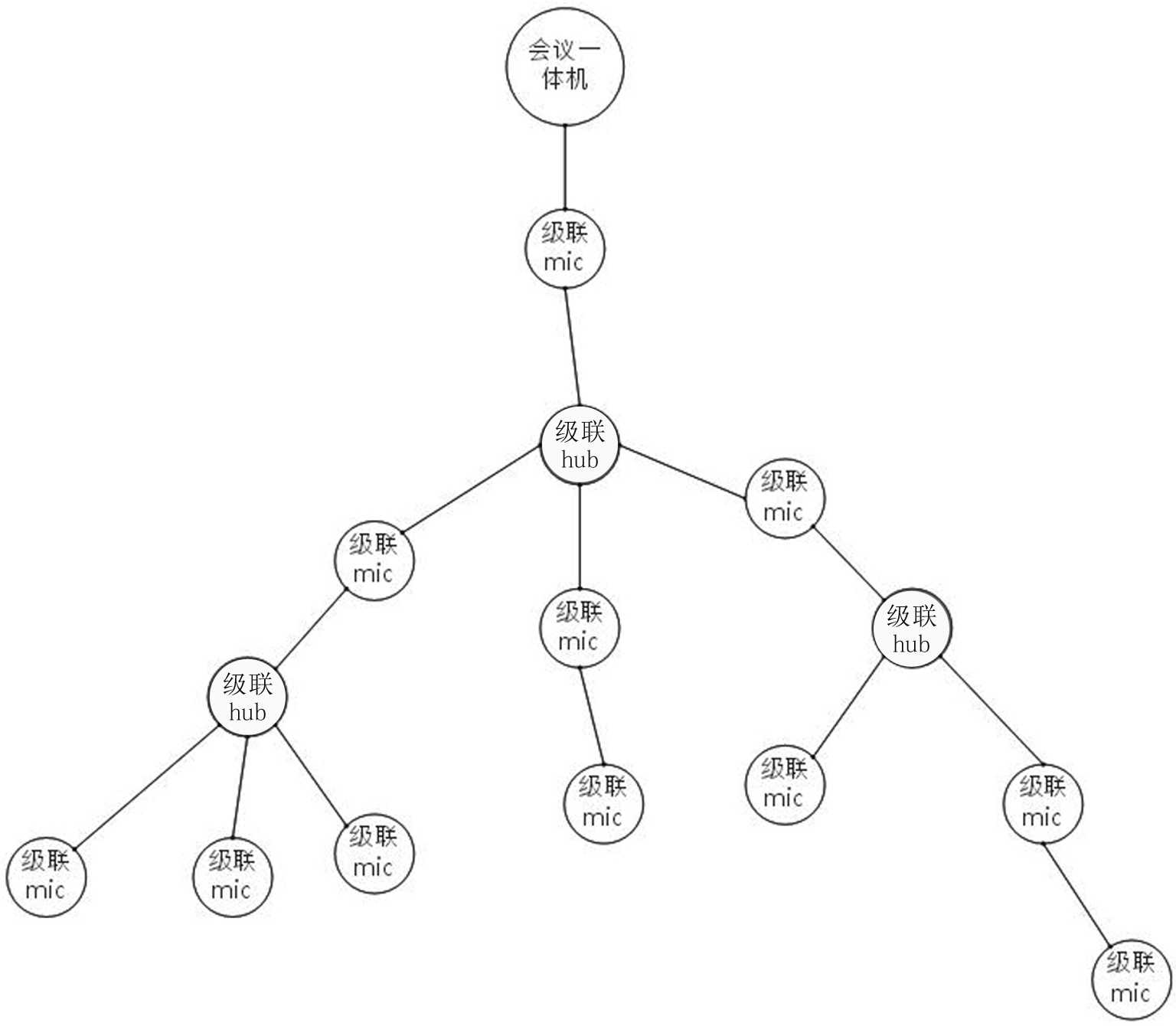 本发明公开了一种大规模组网扩展级联麦克风系统和方法,级联麦克风系统包括:多个级联麦克风,可进行拾音以及拾音后根据从上级设备的级联Hub处接收的参考音频信号完成音频处理,并将处理后的音频数据送给上级设备的级联Hub;级联Hub,在收到一个或者多个下级设备的级联麦克风上传的声音数据后,将进行能量比较,选择能量最大的声音数据送给上级设备的会议一体机;会议一体机,根据从PC机接收的音频信号完成音频处理,将处理后的声音数据与从下级设备的级联Hub传上来的声音数据进行能量比较,选择能量较大的那一路数据送给PC机。本发明实现级联麦克风的大规模组网扩展,从而满足大型会议室或者教室中大规模部署级联麦克风的需求。