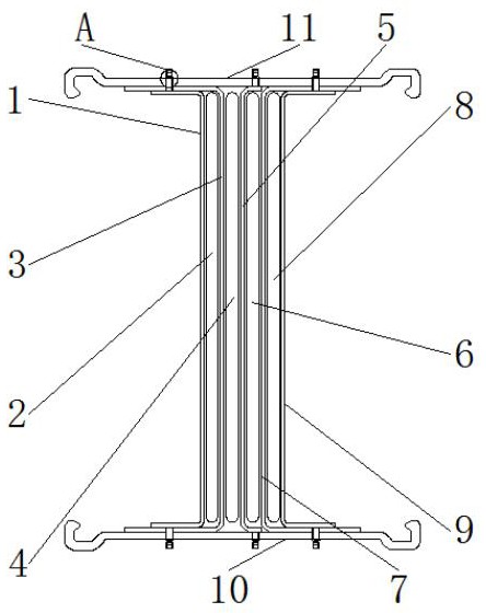 本实用新型公开了一种内置三导热片式密集型母线槽,包括左侧板和限位槽,所述左侧板一侧连接有第一母线;所述第一母线另一侧连接有第一导热片,所述第一导热片另一侧连接有第二母线,所述第二母线另一侧连接有第二导热片,所述第二导热片另一侧连接有第三母线,所述第三母线另一侧连接有第三导热片。该内置三导热片式密集型母线槽设置有左侧板、第一导热片、第二导热片、第三导热片与右侧板可以分别将第一母线、第三母线与第四母线进行夹合,左侧板、第一导热片、第二导热片、第三导热片与右侧板可以通过自身铝材的导热性能强的效果对第一母线、第三母线与第四母线进行导热,方便有效降低母线运行时的温升,提高母线槽的载流能力。