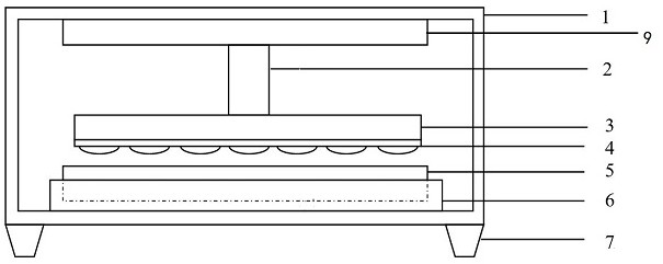 本实用新型涉及树脂粉碎装置,属于复合材料生产领域。设有外壳,外壳底部四角处固定安装支撑脚,外壳内部顶端加工固定装置,固定装置下端安装有冲压装置,冲压装置底端安装有电动冲压杆,电动冲压杆下端均匀排列安装多个金属板,外壳内部底端加工金属槽,金属槽内部可放置树脂托盘,外壳前端加工开口,并在开口处安装柜门,通过安装冲压装置提高了生产和粉碎效率,通过金属板、金属槽和树脂托盘的配合总用使粉碎后的树脂大小更加均匀,提高了成品率,节省了生产成本。