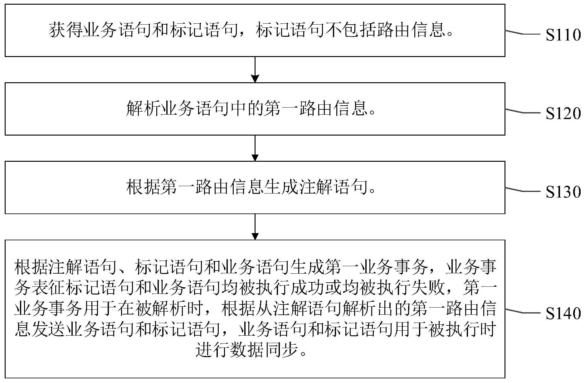 本申请提供一种数据同步方法、装置、电子设备及存储介质,用于改善难以实现基于数据库中间件的数据同步的问题。该方法包括:获得业务语句和标记语句,标记语句不包括路由信息;解析业务语句中的第一路由信息;根据第一路由信息生成注解语句;根据注解语句、标记语句和业务语句生成第一业务事务,业务事务表征标记语句和业务语句均被执行成功或均被执行失败,第一业务事务用于在被解析时,根据从注解语句解析出的第一路由信息发送业务语句和标记语句,业务语句和标记语句用于被执行时进行数据同步。