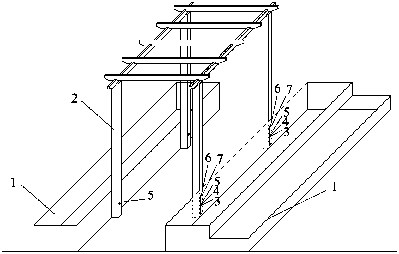 一种组装式景观廊架,包括廊架本体和种植容器、固定机构;廊架本体包括立柱和横梁,立柱竖直设置,顶梁固接在立柱顶部,顶梁上有凹槽,多个横梁跨设在两顶梁之间,横梁插装在凹槽内;种植容器为槽体结构,种植容器的侧壁通过固定机构与廊架本体的立柱连接;镀锌钢板设置在种植容器的侧壁里面,侧壁外面与立柱贴合;立柱和种植容器侧壁上设置有预制螺栓孔;镀锌钢板中央通过螺栓组与侧壁、立柱固定连接在一起,两端通过膨胀螺栓与侧壁、立柱固定连接在一起。这种组装式廊架,根据实际景观环境的需要进行架体和种植容器的组装,在不同安装环境中完成对种植容器的加固,避免膨胀螺栓置于与建筑物接触造成的破损,安全、美观,可反复使用,利用率高。