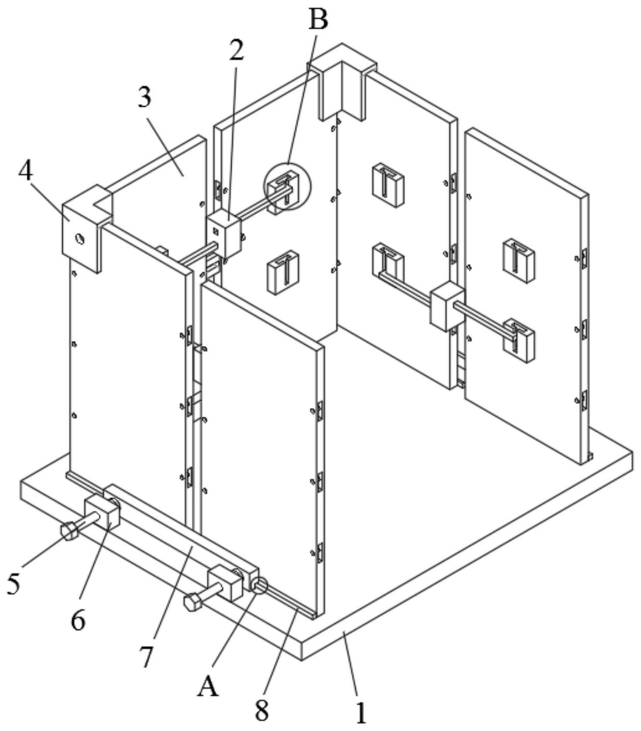 本实用新型公开了一种组装式模块化厕所,包括安装底板,安装底板顶部的一端设置有定位板,定位板上设置有定位槽,安装底板的两侧设置有调节机构;第二组墙板以及第三组墙板均通过连接件与第一组墙板连接;墙板包括安装墙板与锁紧机构;安装墙板的一侧设置有配合块,配合块上设置有配合槽;锁紧机构包括安装壳与拉杆;拉杆设置在安装壳的两侧,拉杆一端与安装壳活动连接,另一端卡接在配合槽内;两端的拉杆错位布置;拉杆靠近安装壳的一侧固接有齿条;安装壳内设置有蜗轮、蜗杆以及调节齿轮;其中,蜗轮与蜗杆均转动连接在安装壳内,蜗轮与蜗杆啮合;调节齿轮与蜗轮端部固接,调节齿轮同时与两侧的拉杆上的齿条啮合。通过这种设计能够保证拼接后的厕所的稳定性。