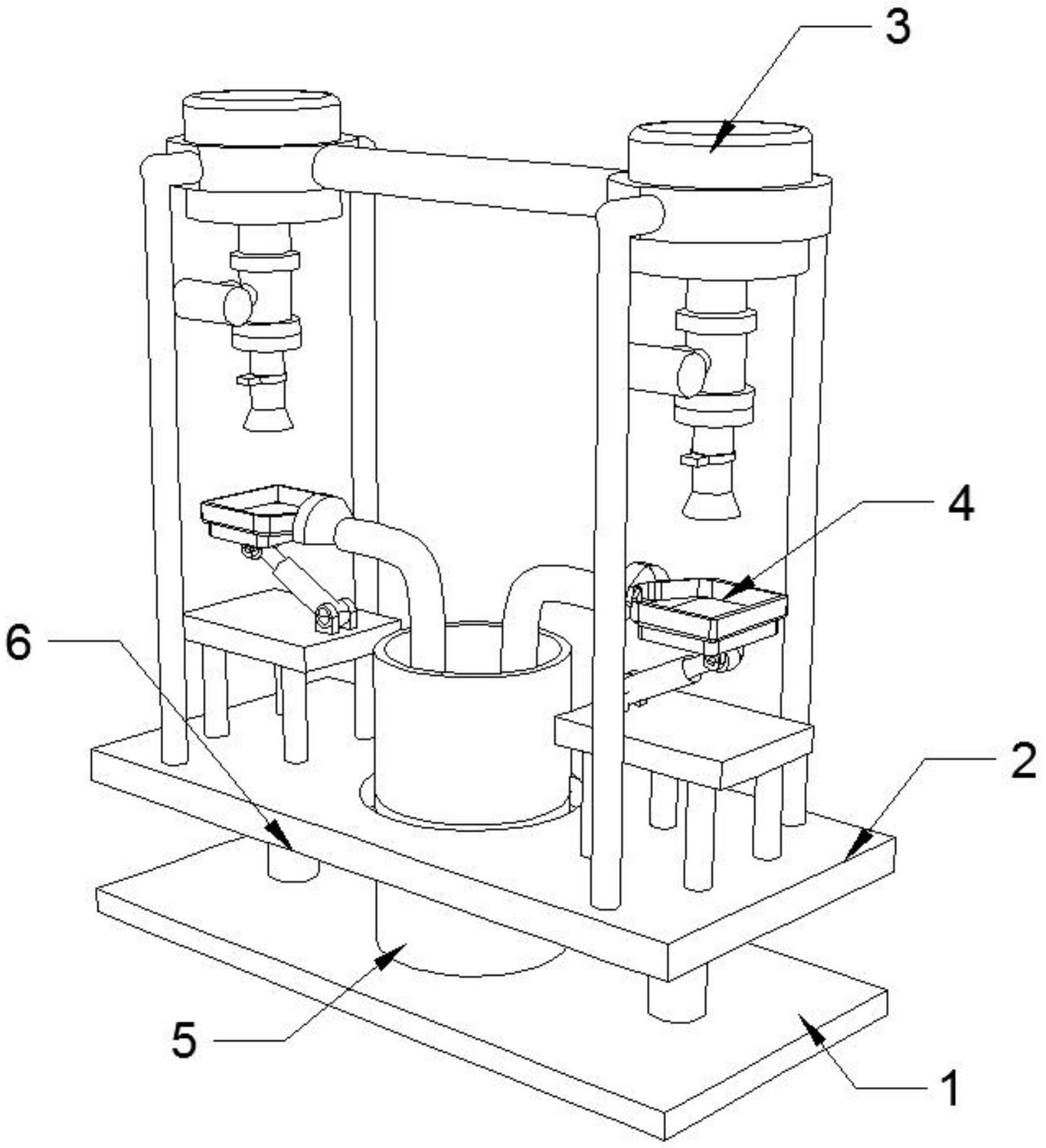 本实用新型提供一种防水卷材自动配料装置,所述防水卷材自动配料装置包括铜基板、支撑板、混合桶和支撑柱,所述基板上表面对称安装有支撑柱,所述支撑柱上表面固定安装有支撑板,所述基板上表面位于支撑板中心处固定安装有混合桶,所述支撑板上表面固定安装有稳定向下输料的输料机构,所述支撑板上表面位于输料机构的对应位置转动安装有活动计量且翻转排料的排料机构,本实用新型提供的防水卷材自动配料装置通过输料机构将制作防水卷材的材料通过排料机构进行计量输送,放置于混合桶内,便于进行后续的制作,便于实现通过称重配比例并进行转动加料,准确性高,利于配料进程的监督控制,提高工作效率。
