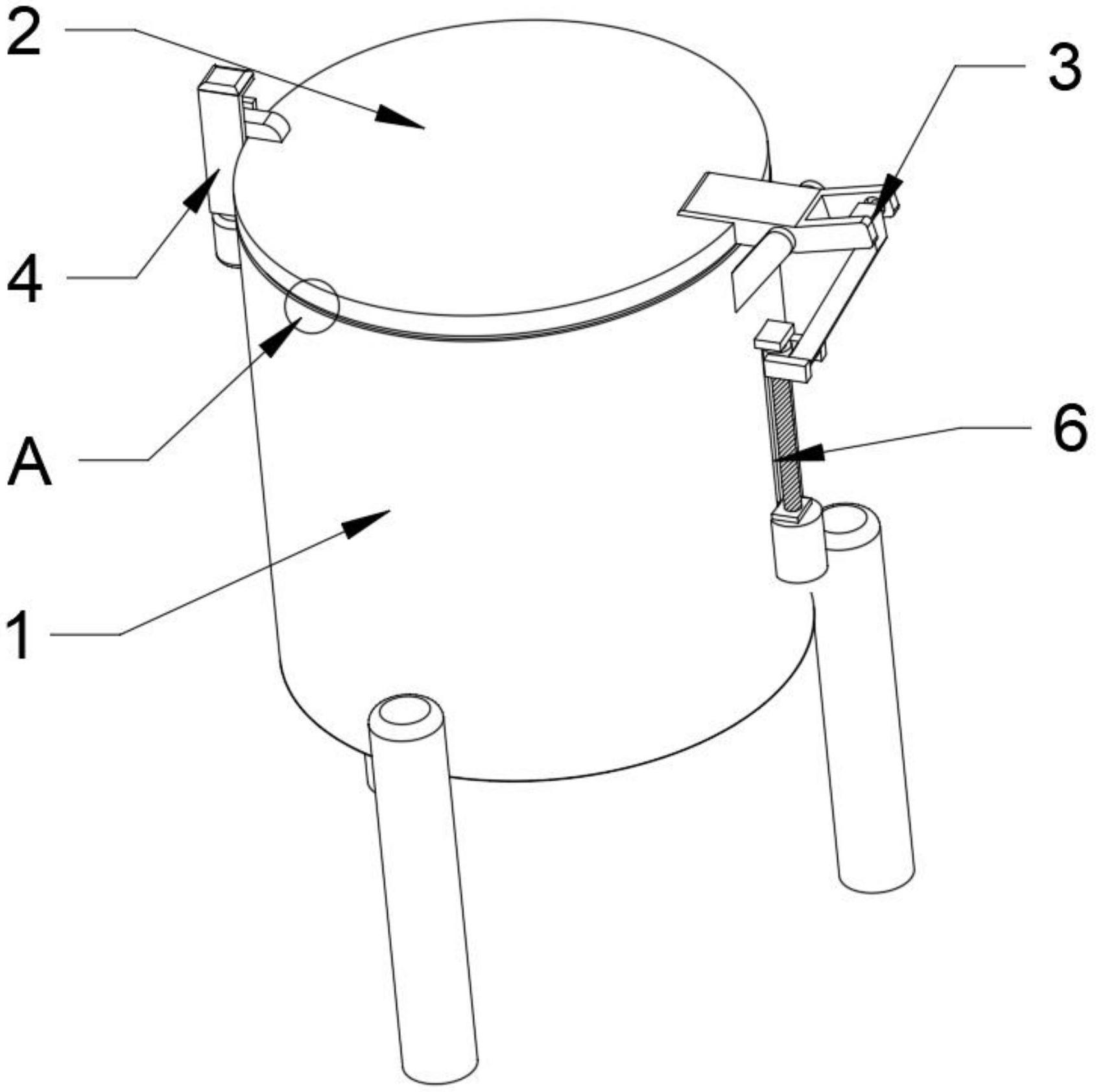 本实用新型提供一种聚氨酯防水涂料生产用反应釜,包括反应釜本体和盖体,所述反应釜本体的顶部设置有盖体,所述反应釜本体外壁的一侧固定有用于自动开合盖体的开合机构,所述反应釜本体外壁远离开合机构的一侧固定有便于压紧盖体使得盖体将反应釜本体密封紧密的压紧机构,所述开合机构包括连接块、第一螺杆、第一电机、螺纹套筒、驱动条、连接条、转动条、圆槽和转动柱,所述反应釜本体外壁一侧的中部对称固定有连接块,两个所述连接块之间通过轴承转动连接有第一螺杆,所述反应釜外壁位于第一螺杆的下端固定有第一电机,本实用新型能够便于自动打开反应釜的盖体,同时能够便于自动锁紧盖体,方便了人们的使用。