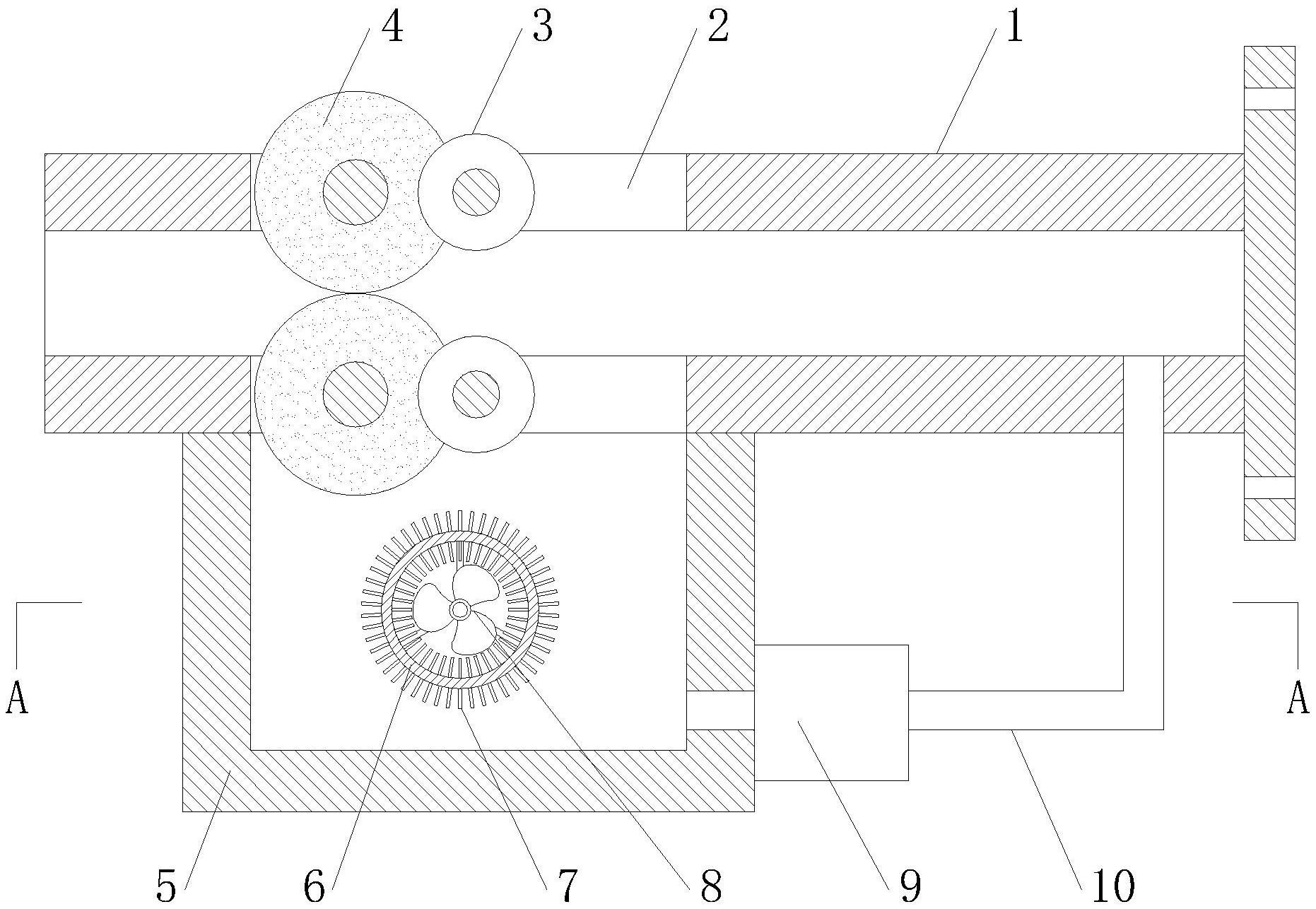 本实用新型公开了一种隔热条挤出用冷却装置,属于隔热条生产设备技术领域。它包括安装管,安装管的一端固定连接有法兰盘,安装管的上下两端均开设有开口,两个开口的内部设置有用于擦干隔热条上水分的干燥机构,安装管的底部固定连接有水箱,水箱与安装管底部的开口相连通,且水箱的内部设置有用于降低水温的散热机构,水箱的一侧固定连通有水泵,水泵上连通有水管,水管的一端与安装管靠近法兰盘的一端固定连通。本实用新型通过安装管的设置,隔热条在安装管的内部穿行,同时水泵将水箱内的冷却水不断地抽入安装管内进行循环流动,使得隔热条与冷却水直接接触,起到快速冷却定型的效果。