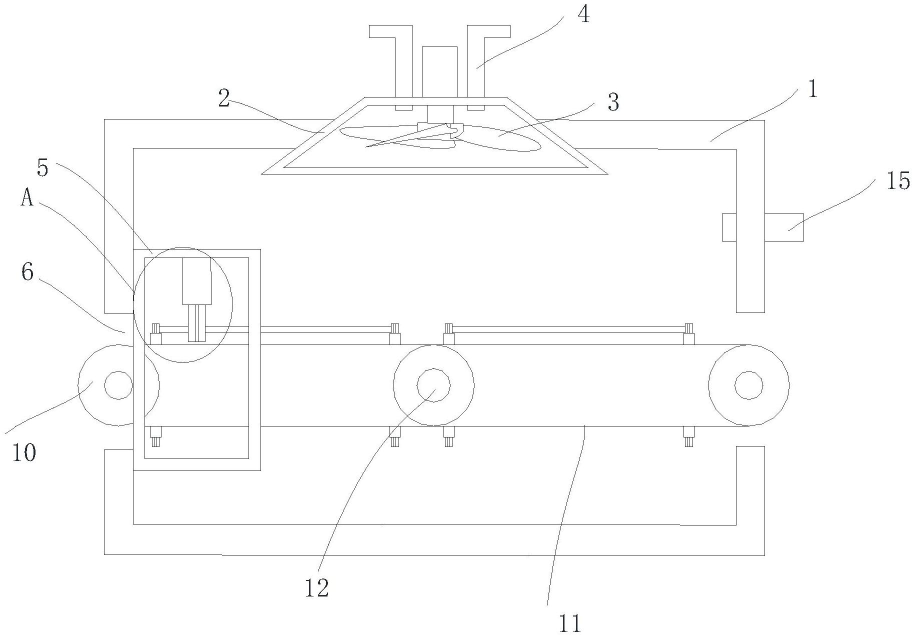 本实用新型公开了一种隔热条生产用干燥装置,属于隔热条生产辅助设备技术领域。它包括第一箱体,所述第一箱体的顶部固定安装有风罩,所述风罩的内部固定安装有风机。本实用新型主要利用第二箱体内部的擦拭机构先对板链上的隔热条原料进行初步擦拭,即相对给隔热条原料进行初步干燥,再利用第一箱体上风罩内部经加热丝加热的热空气对隔热条原料进行二次干燥,通过两种干燥方式的结合,从而对隔热条原料上经冷却而产生的水滴进行去除,从而避免出现冷却后进入切割机时将水带入切割机而影响切割效率以及切割质量,同时影响切割机进料端、切割刀生锈的情况。