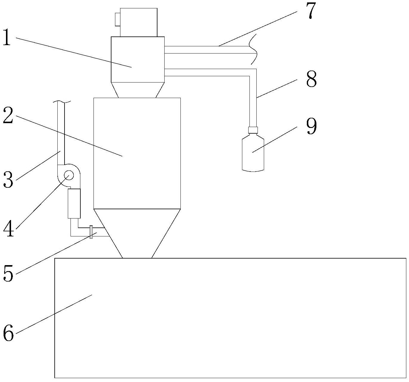 本实用新型公开了一种隔热条注塑成型用废气处理装置,属于废气处理设备技术领域。它包括多个注塑机,每个注塑机的进料口均固定连通有料斗,每个料斗的顶部均固定连通有吸料机,每个吸料机上均连通有吸料管,每个料斗的侧壁均固定连通有法兰管,每个法兰管的一端均密封固定连通有抽风机,每个抽风机的出气口均固定连通有支管道,多个支管道的一端共同固定连通有主管道,主管道的一端固定连通有净化器。本实用新型通过抽风机将注塑机作业过程中产生的废气和灰尘收集起来,避免其扩散在车间中而危害工人的健康,并且该装置能够同时集中处理整个厂房中的多组注塑机,大大地提高了废气的处理效率,并且结构简单,制作和维护成本低。
