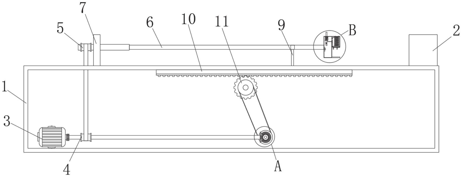 本实用新型公开了一种隔热条加工用拉拔测试装置,涉及隔热条生产技术领域,包括底座,所述底座的顶部设置有检测装置,所述底座的内壁与电机的底部固定连接,所述电机的传动轴贯穿皮带轮A且与皮带轮A固定连接,所述皮带轮A通过皮带与皮带轮B传动连接,所述皮带轮B被伸缩杆贯穿且与伸缩杆固定连接,所述伸缩杆贯穿支撑架且与支撑架转动连接,所述支撑架的底部与底座的顶部固定连接,通过夹紧装置夹紧隔热条,启动电机,电机带动锥形齿轮B转动,锥形齿轮B通过锥形齿轮A带动传动轮转动,传动轮通过传动带带动齿轮旋转,齿轮带动齿条向左移动,齿条通过连接杆将伸缩杆向左拉动,具有便于测试隔热条的拉拔的优点。