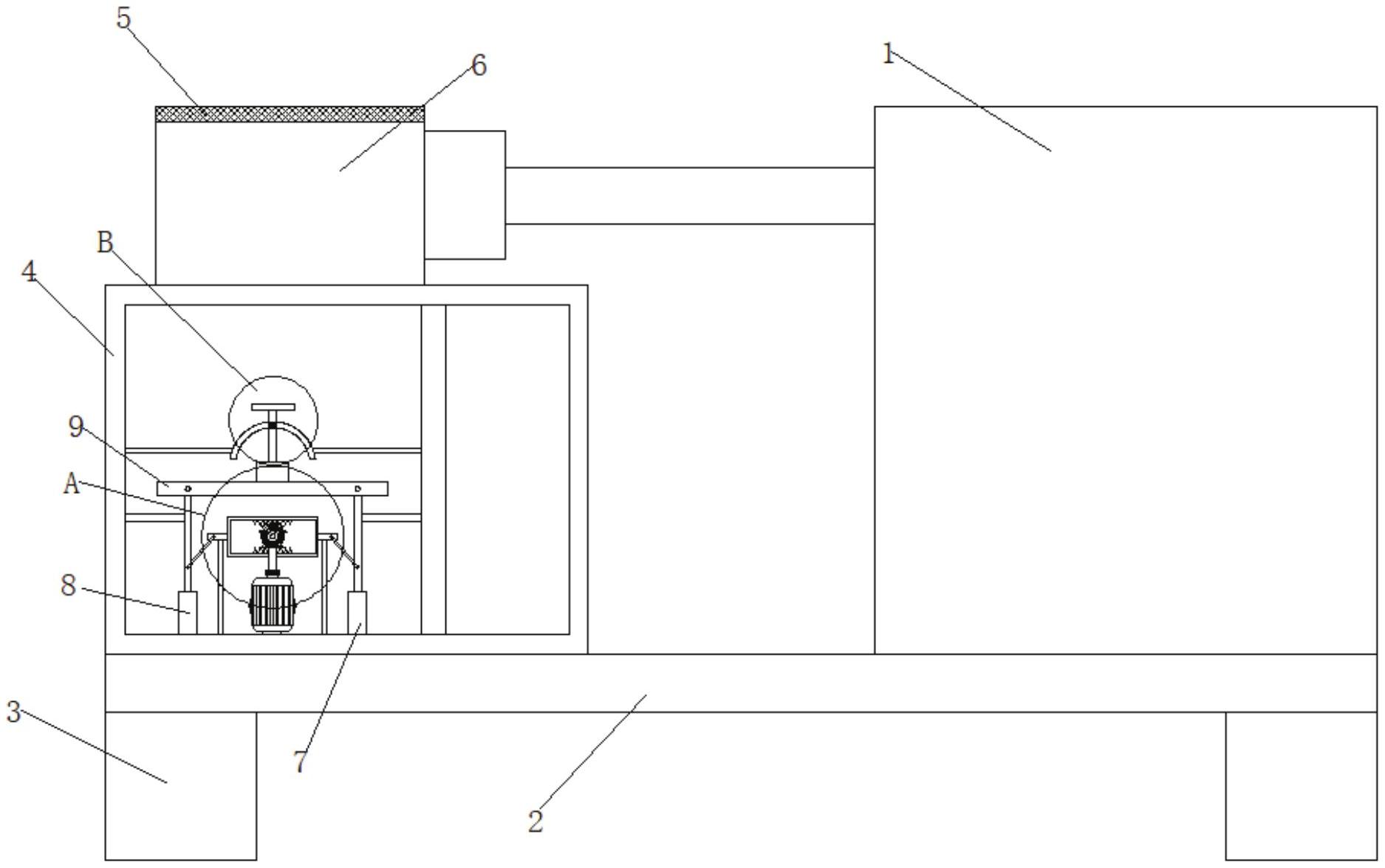 本实用新型公开了一种隔热条挤出机的冷却机构,涉及隔热条挤出机技术领域。该装置包括挤出机,所述挤出机的底部与底座的顶部固定连接,所述底座的底部与座腿的顶部固定连接,所述底座的顶部与动力仓的底部固定连接,所述动力仓的顶部与硬齿面减速器的底部固定连接,所述硬齿面减速器的顶部设置有散热网,所述动力仓的底部内壁与电机的底部固定连接,所述电机通过电机传动轴与传动柱传动连接,所述传动柱固定连接有一号弧形齿轮,所述一号弧形齿轮与二号弧形齿轮啮合,该装置通过风扇可以实现将挤出机上的硬齿面减速器进行很好的散热,从而提高硬齿面减速器的使用寿命以及使用效果,提高了该装置整体的实用性。