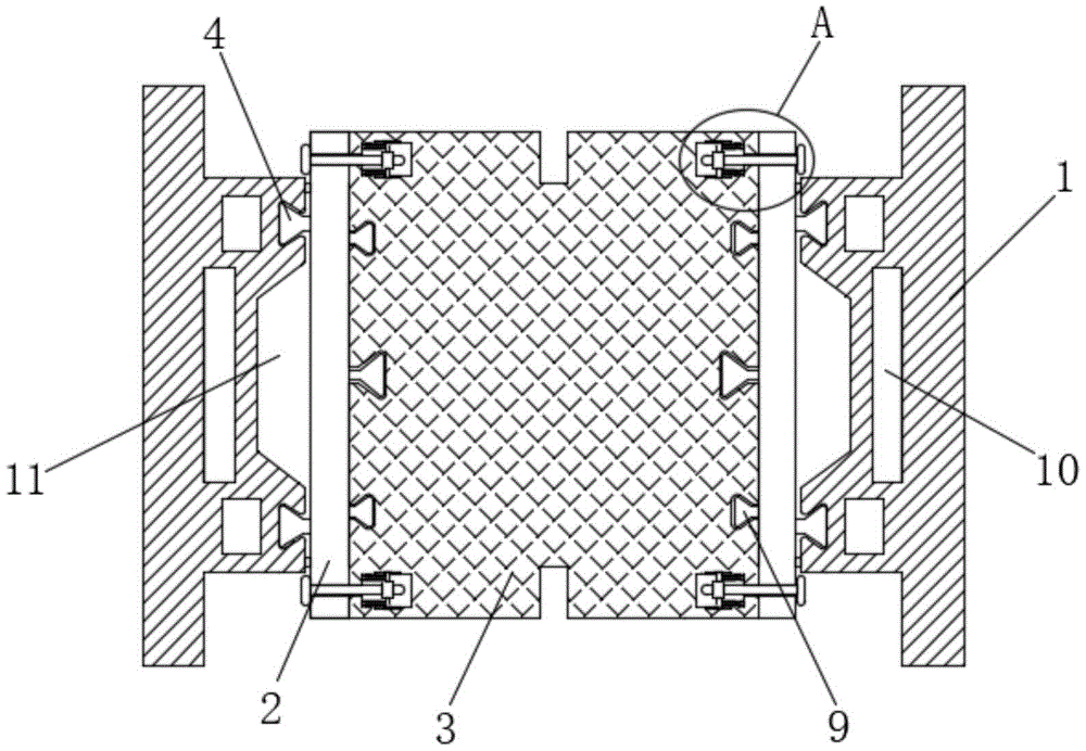 本实用新型公开了一种新型隔热暖桥结构,包括两个合金板、两个隔热条和硬质芯,所述隔热条的两侧侧壁均固定连接有多个第一楔形块,所述合金板的侧壁和所述硬质芯的侧壁均开设有多个与第一楔形块匹配的第一楔形槽,所述硬质芯中开设有多个安装腔,所述安装腔的上下内壁之间均滑动连接有活动杆,两个所述活动杆的侧壁之间固定连接有螺母,所述隔热条的侧壁横向设有多个螺栓,所述螺栓贯穿隔热条、安装腔的内壁和螺母,多个所述活动杆的侧壁均通过复位弹簧与安装腔的内壁固定连接。本实用新型转动螺栓,调节螺母的位置进而带动复位弹簧形变,这样调节硬质芯和隔热条的松紧程度,保证长久使用后也具有良好的断热桥性能。