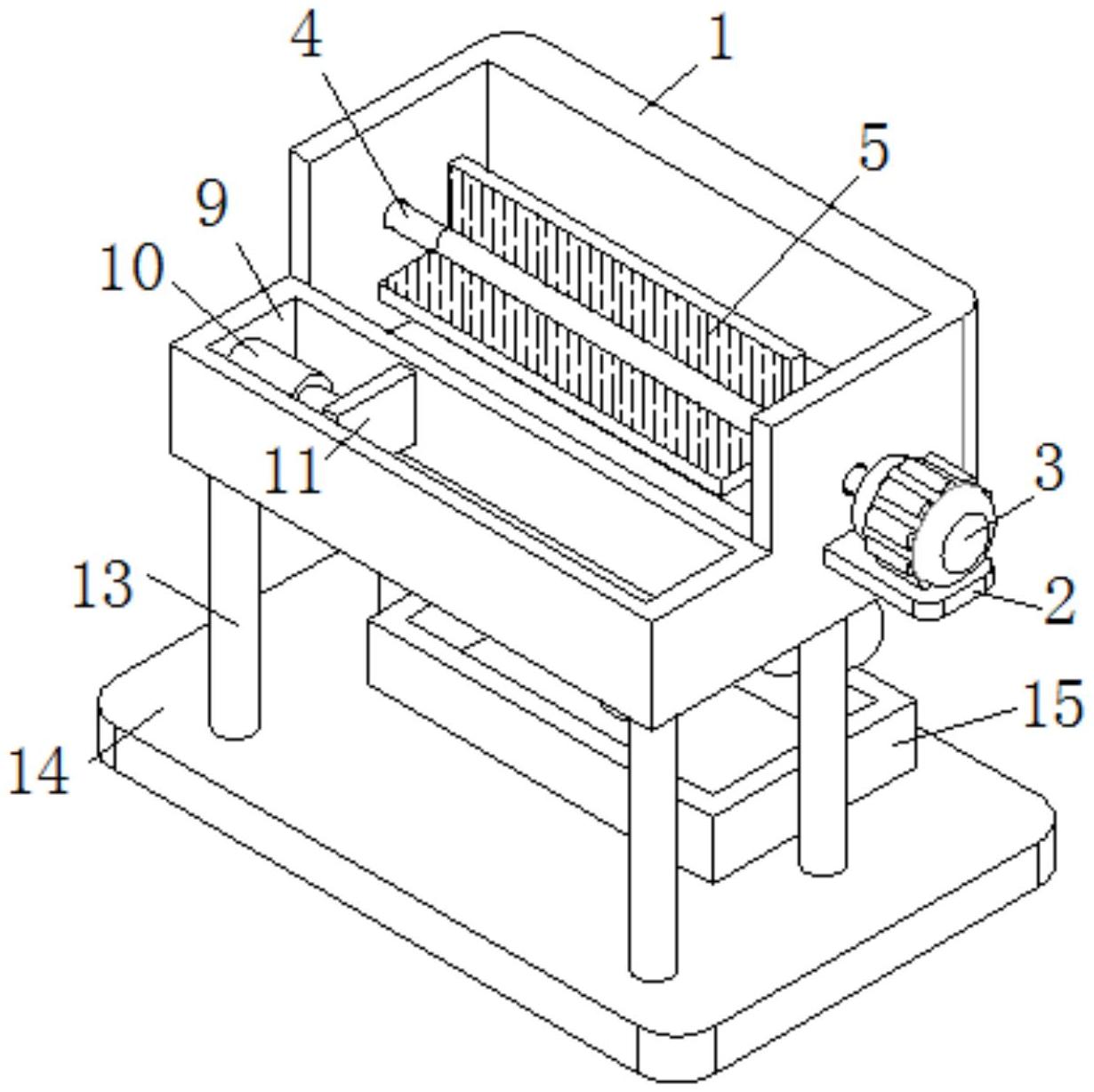 本实用新型提供一种过滤机的翻板式接液装置,属于过滤机技术领域,该过滤机的翻板式接液装置包括过滤机外壳,所述过滤机外壳的一侧固定连接有支撑板,所述支撑板的上表面固定连接有伺服电机,所述伺服电机的输出端固定连接有转轴,所述转轴的外表面设置有翻板,所述过滤机下表面的两侧均固定连接有出料管;过滤机外壳、支撑板、伺服电机、转轴、翻板、出料管、分液管、出液管和储液盒之间的配合设置,伺服电机的转动,从而控制翻板转动,可对液体进行过滤,由于出液管的数量为多个,则在排放液体时,排放效率更高,并且可多人同时进行液体封装,如果有滴漏的液体则会直接落入储液盒内部,便于对其进行收集,避免浪费。