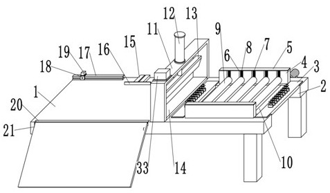 本实用新型公开了一种隔热条生产用切割装置,包括工作台,工作台顶部外壁两侧通过螺栓安装有支架,且支架顶部外壁上通过螺栓安装有第一气缸,第一气缸的输出端通过螺栓安装有切刀,且切刀一侧外壁上通过螺钉安装有电热丝,工作台顶部外壁一侧通过螺钉安装有位于支架内部的刀台,工作台顶部外壁一侧通过螺栓安装有滑轨,且滑轨外部滑动连接有安装板。本实用新型在切割时,可以根据需要切割的长度在对隔热条进切割,有利于提高隔热条切割的工作效率,降低工作人员的劳动强度;在切割时,传送带可以运输隔热条,同时压辊与滑轮可以对传送带运输的隔热条进行限位,从而避免工作人员手持隔热条切割时受伤,有利于提高该装置的安全性。