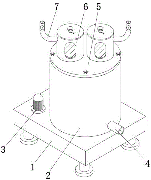 本实用新型公开了一种隔热条生产用热熔真空混料装置,包括底座,底座的顶部外壁上通过螺栓安装有混料罐,且混料罐的顶部外壁上通过螺栓安装有盖板,盖板与混料罐的底部内壁之间通过轴承转动连接有绞龙,且绞龙的底端贯穿至底座的下方,绞龙的侧面外壁上焊接有呈等距离分布的连接杆,且连接杆远离绞龙的一端焊接有刮板,混料罐的底部内壁上焊接有隔板,且隔板的一侧外壁上通过螺栓安装有加热管,底座顶部外壁的一侧通过螺栓安装有真空泵,底座的一侧外壁上插接有抽气管。本实用新型在装置运行的过程中,同时也会带动刮板运动,使得刮板不断地将装置内壁上粘结地原料刮下,防止原料堆积难以清理,使得装置的使用寿命大大提升。