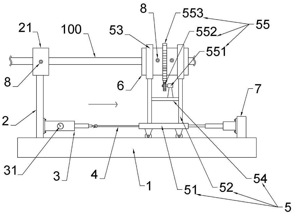 本实用新型涉及一种隔热条拉拔装置,包括底板,底板上固定设有支撑杆,支撑杆上固定设有固定环,拉杆远离数显拉力计的一端固定设有移动架,移动架上转动设有扭转环,液压缸的输出端与移动架固定连接,首先将待检测的隔热条依次穿设于固定环、扭转环内并进行固定,通过液压缸驱动移动架移动,拉杆同步拉伸数显拉力计,此时数显拉力计显示的是未扭转情况下的拉力值;抽出拉伸后的隔热条,再选取一根未拉伸的隔热条穿设于固定环、扭转环内并进行固定,当驱动扭转环转动后,使得隔热条发生扭转,然后驱动移动架移动,此时数显拉力计显示的隔热条扭转情况下的拉力值,从而方便工作人员了解不同检测方式下隔热条的拉拔情况。