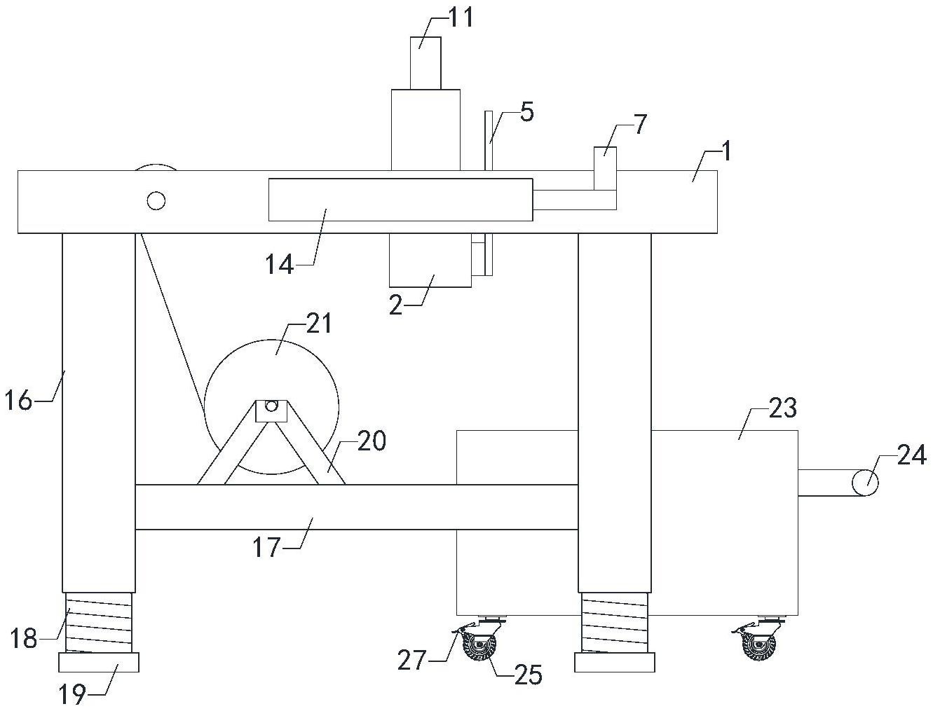 本实用新型涉及机械设备的技术领域,特别是涉及一种门窗隔热条生产用切割装置,其通过设置此设备,不仅节省了大量的人工,提高了工作效率,也提高了设备的自动化,保证了设备的稳定性,从而提高隔热条的切割效果;包括工作台、第一气缸、第一推杆、切割刀、门型架、移动板、两组固定板、两组第二气缸和两组夹板,工作台底端设置有支撑装置,支撑装置上设置有放料装置,并且放料装置与工作台左部配合连接,两组固定板安装在移动板左端,两组第二气缸分别安装在上侧固定板顶端和下侧固定板底端,两组第二气缸输出端分别穿过两组固定板伸至两组固定板内侧,两组夹板分别安装在两组第二气缸输出端,并且两组夹板的位置对应。