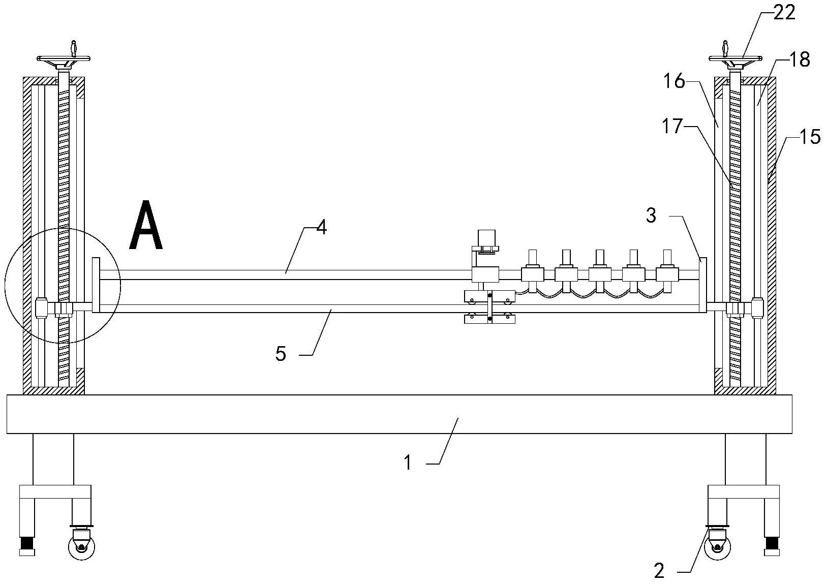 本实用新型涉及隔热条生产的技术领域,特别是涉及一种隔热条加工用牵引机,其通过设置,可对隔热条起到支撑的作用,防止其被架空变形,保障后期的使用效果;包括底座、四组移动装置、四组升降装置、两组安装板、第一滑杆、第二滑杆、牵引小车、第一滑套、竖板、横板、气缸、压板、多组第二滑套、多组护板和多组连接绳,底座底端和四组移动装置顶端固定连接,四组升降装置分别安装在底座顶端的四个角上,一组安装板安装在左侧两组升降装置的右端,另一组安装板安装在右侧两组升降装置的左端,第一滑杆固定安装在两组安装板之间,第二滑杆固定安装在两组安装板之间,第二滑杆位于第一滑杆下方,牵引小车滑动安装在第二滑杆上。