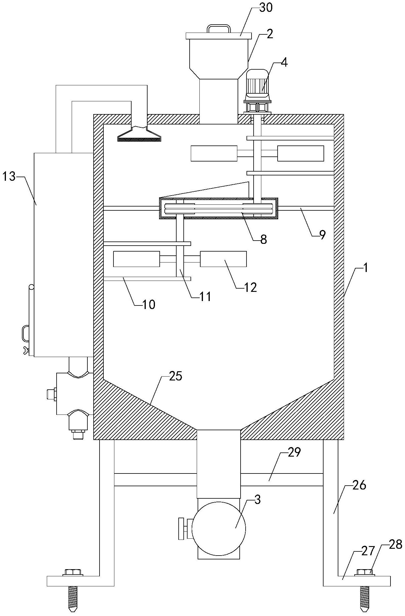 本实用新型涉及隔热条生产的技术领域,特别是涉及一种门窗隔热条生产用上料机构,其通过设置,可提高原料的洁净度,加强隔热条的生产效果;包括清理筒、电机、两组第一固定板、两组第一打击板、传动装置、两组固定杆、两组第二固定板、第二转轴、两组第二打击板和吸尘装置,清理筒内设有腔室,清理筒顶端设有进料漏斗,清理筒底端设有出料阀,电机底端和清理筒顶端固定连接,两组第一固定板右端固定安装在清理筒内壁上,电机的输出端设有第一转轴,第一转轴可转动穿过清理筒顶端和两组第一固定板,两组第一打击板固定安装在第一转轴上,第一转轴底端和传动装置顶端转动连接,传动装置依靠两组固定杆固定安装在清理筒腔室内。