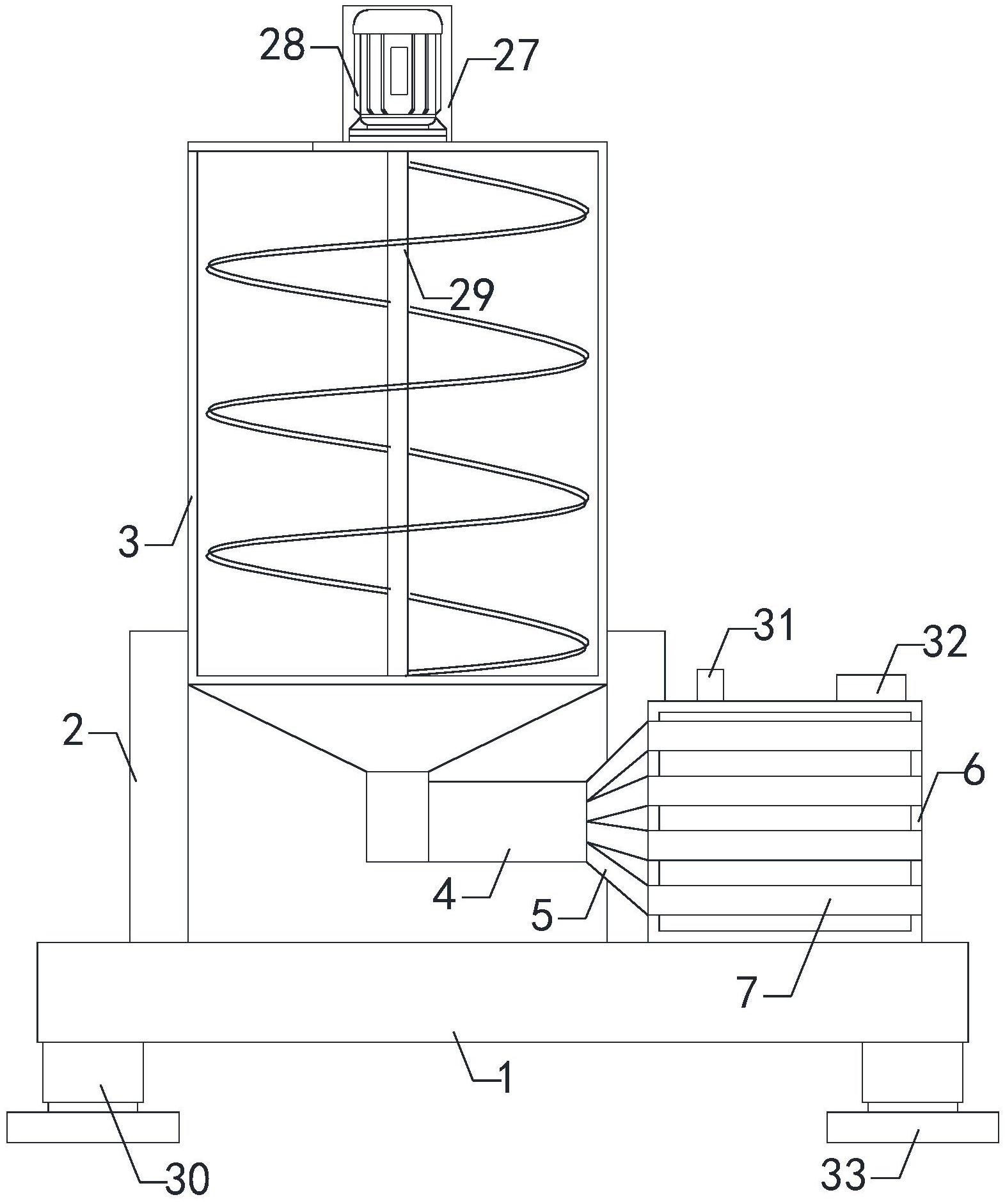 本实用新型涉及隔热条生产的技术领域,特别是涉及一种铝合金门窗隔热条的挤出模机构,其提高隔热条冷区成型速度,增加生产工作效率,提高工作稳定性,降低使用局限性;包括安装底座、支撑架、原料输送罐、控制阀、分散输送管、固定安装箱、定型模具、启动开关和输送机构,分散输送管左端与控制阀右端连通,分散输送管右侧多个输出端分别与定型模具输入端连通,输送机构输出端位于原料输送罐空腔内部;还包括拖件、水泵、第一轴承、摆动轴、固定件、喷水头、连接软管、排水阀、从动齿轮和摆动机构,水泵底端安装在安装底座顶端,摆动轴通过第一轴承转动安装在固定安装箱空腔内部,摆动机构与从动齿轮配合连接,水泵与启动开关通过导线电性连通。