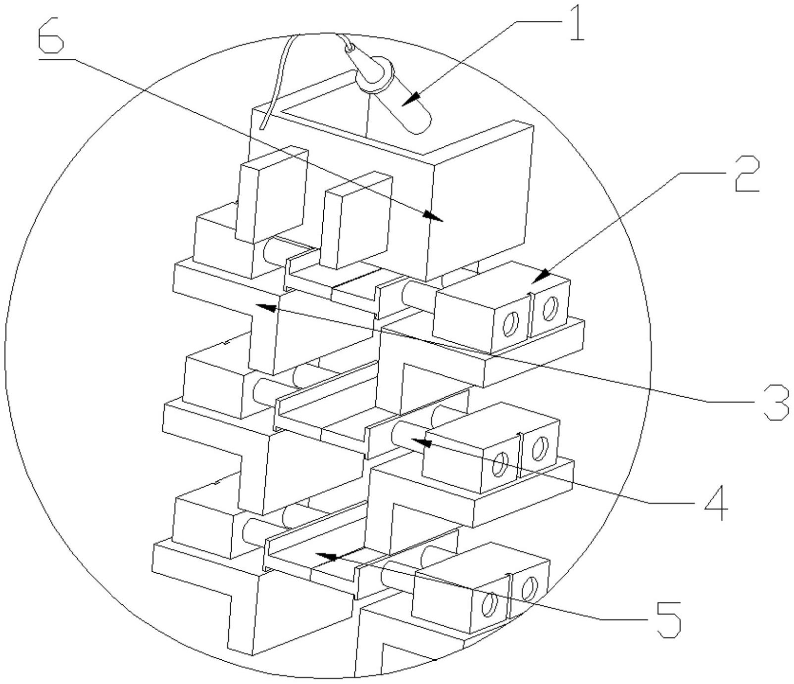 本实用新型公开一种用于袋装药剂装盒的分料机构,包括机架,机架上设置有气缸座、双轴气缸和挡板,气缸座的中间开设有落料通道,气缸座的两侧设置双轴气缸,双轴气缸的伸出轴固定安装有挡板,挡板通过双轴气缸的伸缩控制落料通道的启闭,机架的上端设置有电眼,电眼用于监测分料传送带上袋装药剂的输送情况进而控制双轴气缸动作,本实用新型摒弃传统的开闭器对袋装药剂分料,解决了袋装药剂在筛选过程中噪音大、故障多、开闭器易撞坏、输送不畅等问题,通过三层结构的逐层分料,可以实现对袋装药剂的精准筛料和定距落料,既可以有效防止袋装药剂中的空袋现象以及提高良品率,且可以协助后续袋装药剂的装盒封装工序,大大提高了自动化生产效率。