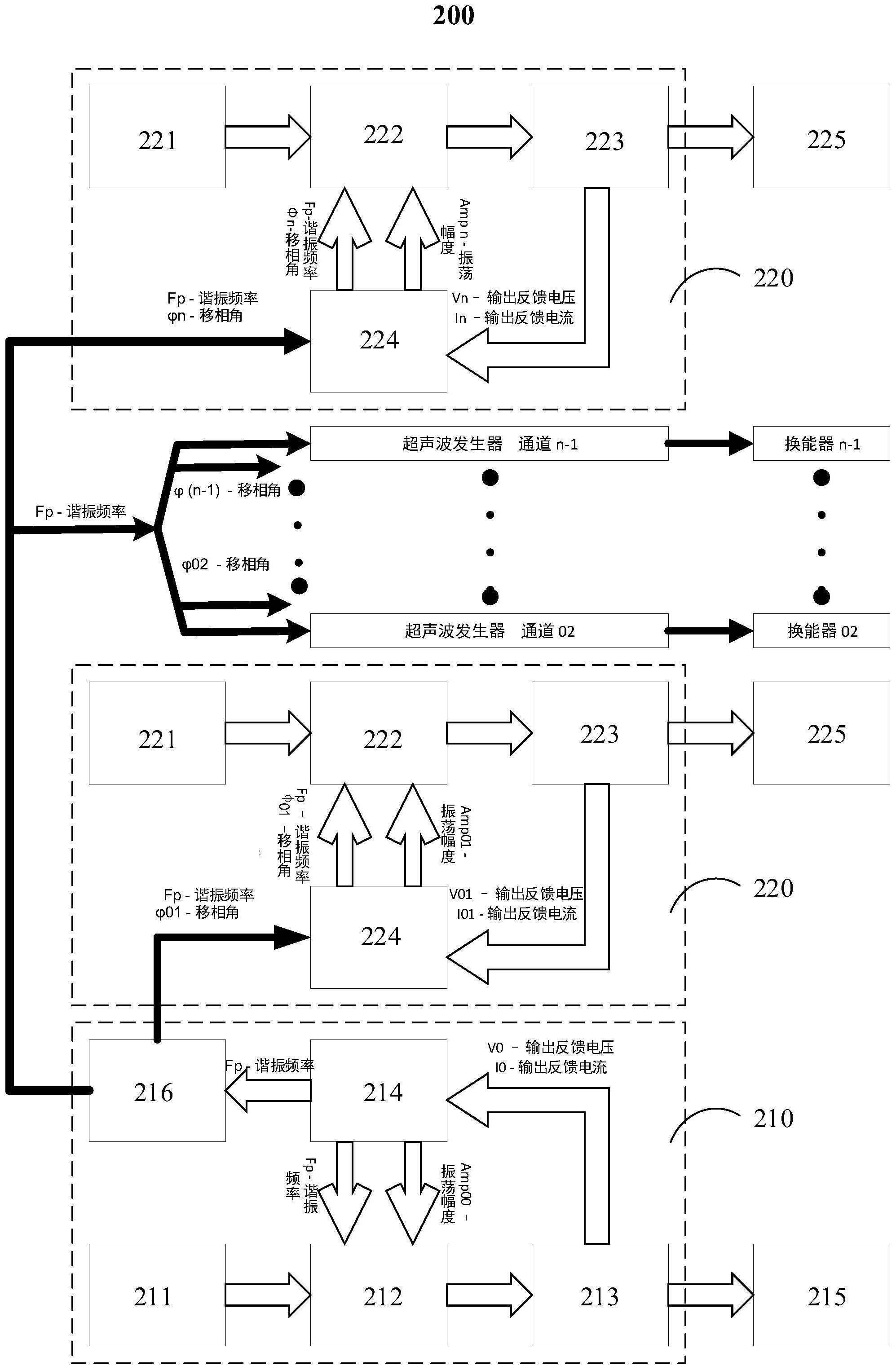 本发明公开了一种超声波发生器,包括多个超声波发生器支路以用于驱动相应的多个超声波换能器,每个超声波发生器支路中包括直流电源、超声波振荡器、直流/交流变换器,以及阻抗匹配输出网络,该多个超声波发生器支路中包括一路超声波主发生器和至少一路超声波辅发生器,该超声波主发生器的超声波主振荡器基于对应超声波换能器的反馈信号生成用以控制该超声波主发生器的直流/交流变换器的主振荡信号,每一路该超声波辅发生器的超声波辅振荡器使用基于该超声波主振荡器输出的该主振荡信号的振荡信号源生成谐振频率与该主振荡信号相一致的辅振荡信号以控制该路超声波辅发生器的该直流/交流变换器。