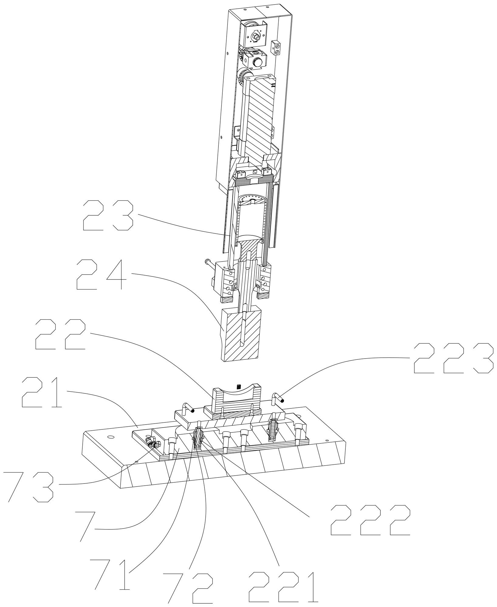 本实用新型涉及一种快速换模的超声波焊接机,解决现有的焊接机无法实现快速换模,工作效率低的问题。包括有机座,设于机座上的焊接机构,焊接机构包括有焊接平台,超声定模,焊接头,以及设超声动模,超声定模通过气压零点定位器与焊接平台连接,超声定模底部设有定位套,定位套的中部设有定位卡槽,气压零点定位器的中间设有定位槽,定位槽内设有用于将定位卡槽卡在定位槽内的钢珠,气压零点定位器上设有与定位槽连通的气道,气压零点定位器还包括有用于驱动钢珠散开的气压泵。从而通过气压使钢珠散开,当定位卡槽进入到定位槽内,切断压力,则钢珠向中心聚拢将定位卡槽卡住,从而实现超声定模的自动快速锁紧定位,减少了超声定模锁紧定位找正时间。